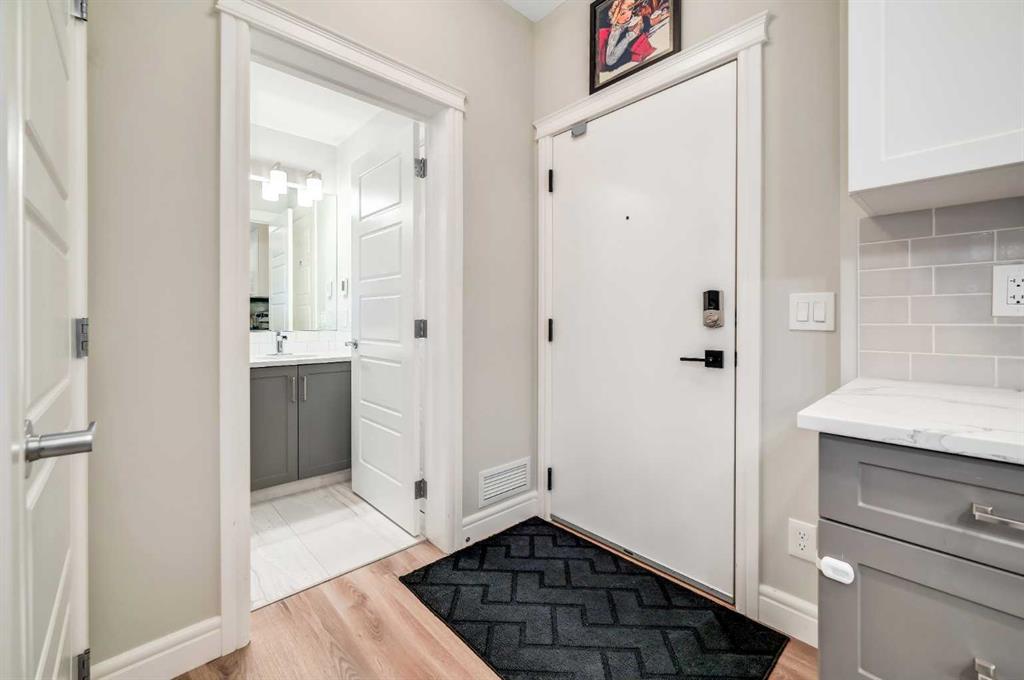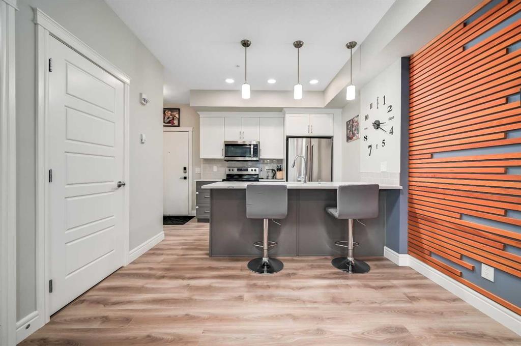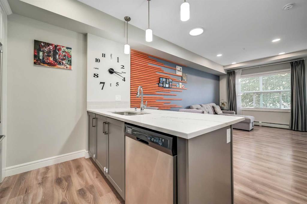 Exceptional, turnkey value in this well upgraded unit in desirable Seton! Just steps to all amenities including restaurants, Seton YMCA, scenic walking & bike pathway system, Cineplex VIP, nightlife, shops, big box retailers, & the South Health Campus medical center! Leave the car at home and enjoy the relaxed atmosphere of Seton away from the hustle and bustle of Calgary\'s core. Like new unit, with a modern open plan and tall 9\' ceilings. Substantially upgraded from the standard builder\'s package with deluxe stainless-steel appliances, quartz countertops throughout, stained wood feature wall, & built-in fireplace with tile clad full height surround! Upgraded full bathroom with custom marble style tilework & full body shower jets. Quiet, main floor unit with ground level patio ideal for pets! Luxury vinyl plank flooring throughout the unit, with designer chosen colors. In-suite laundry + visitor spots. Ample parking for visitors & free street parking is nearby & abundant. Well managed building with very low condo fees, just pay electricity! Incredibly affordable home in a fantastic location in Seton, or a smart investment for someone looking to capitalize on proximity to the South Health Campus, Calgary\'s newest and state-of-the-art medical center.