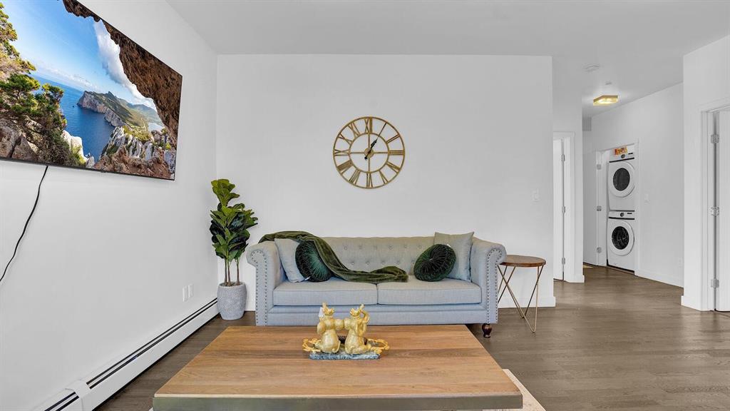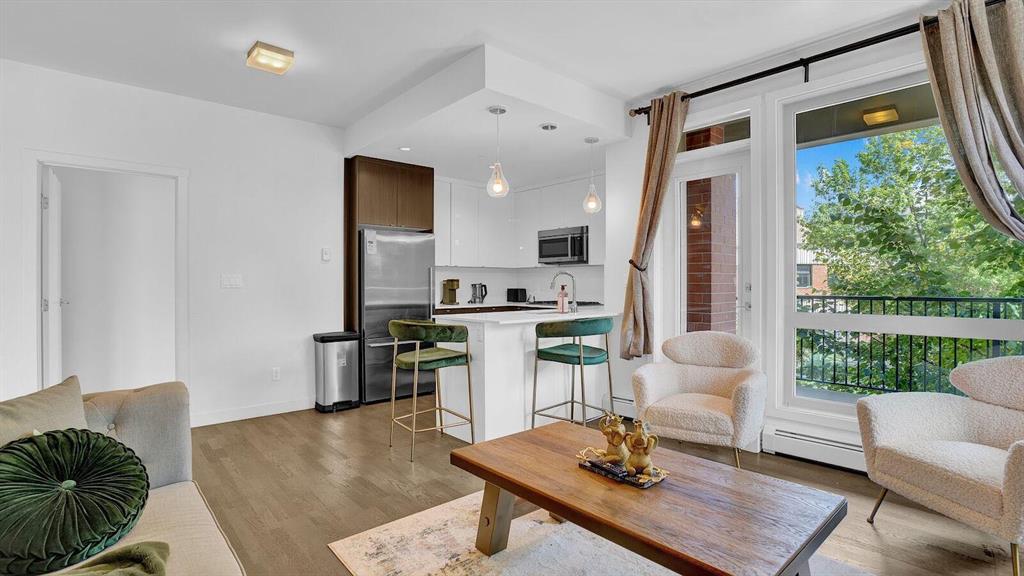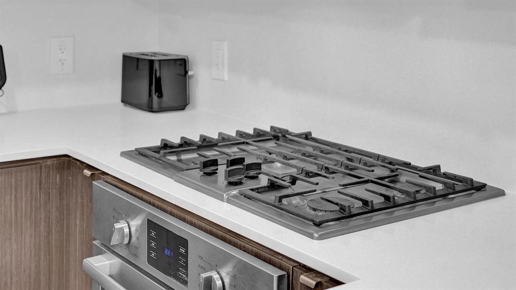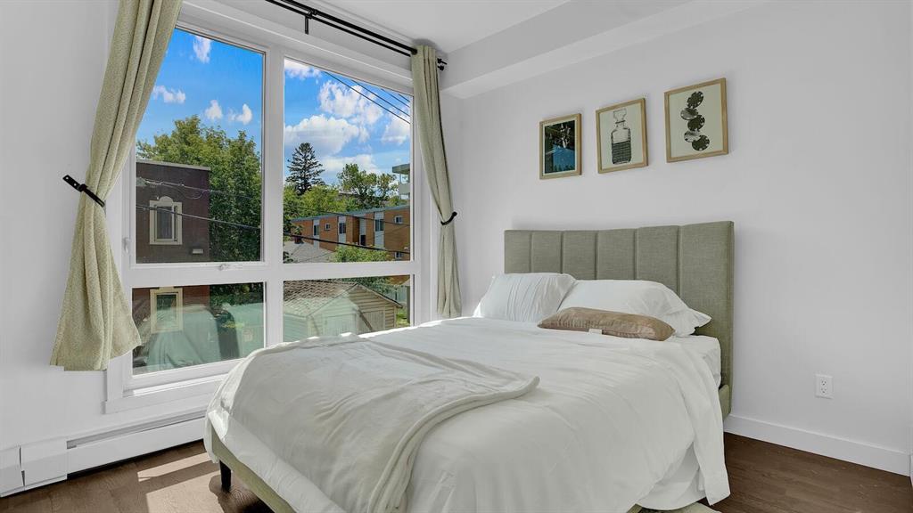 Introducing an exceptional real estate opportunity. Welcome to this stunning 2 bed/2 bath downtown view condo, complete with underground parking and storage. This unit offers an amazing layout and is equipped with all the builder upgrades, making it arguably the best in the building. As you enter, you\'ll be captivated by high ceilings and double stacked windows, creating a bright and spacious atmosphere. The open floor- plan is thoughtfully designed to maximize space and comfort, providing an executive feel. Large primary bedroom, unit has breathtaking downtown views and features a walk-through closet leading to a spa-inspired en-suite bathroom. The second bedroom and bathroom are conveniently separated by the open concept living area, ensuring privacy and functionality. This unit offers a range of impressive features, including engineered hardwood floors, quartz counters, a gas range, undermount lighting in the bathrooms, air-conditioning, and in-suite laundry. Enjoy the outdoors from the corner balcony with a gas line for your barbecue. Located in a well-managed and pet-friendly building, this condo is situated in one of the most vibrant areas of the city. With the river, numerous restaurants, nightlife, and shopping on 17 Ave just steps away, you\'ll experience the finest in inner-city living.