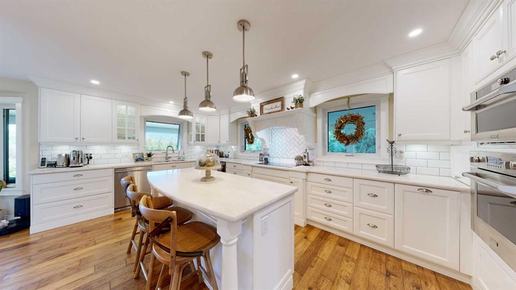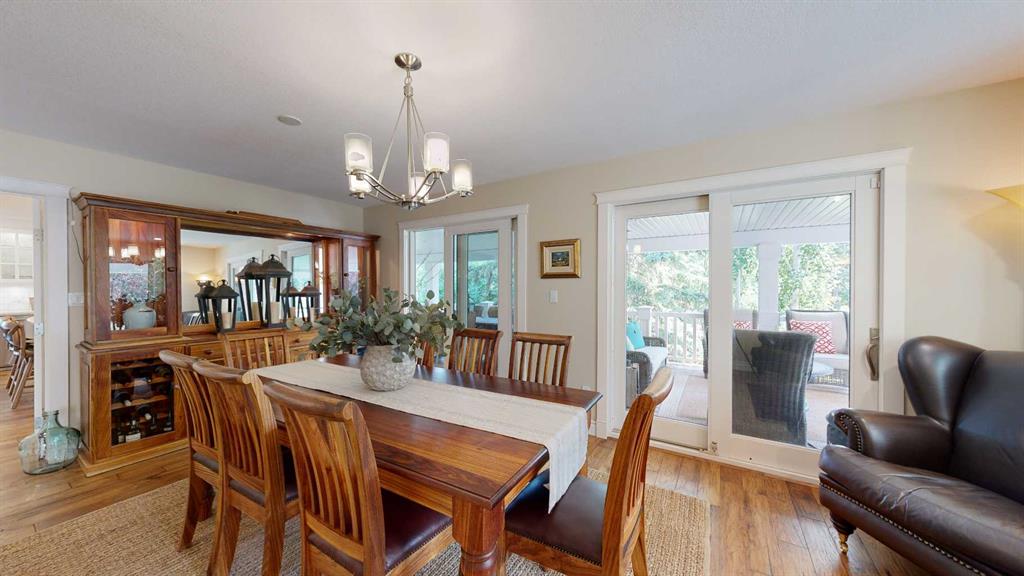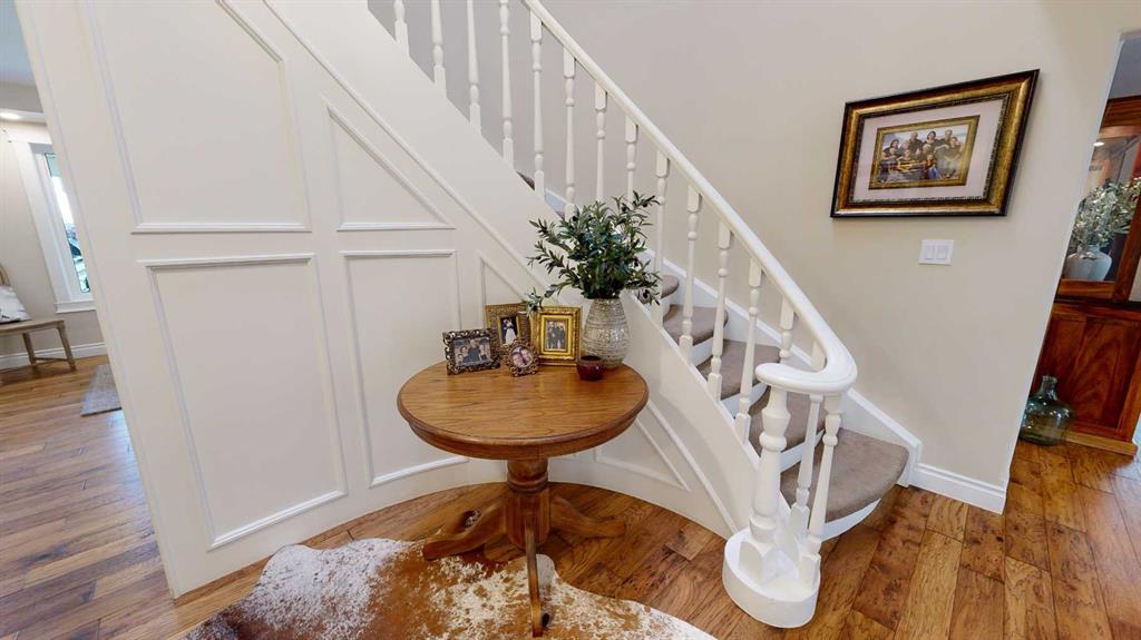This is a once in a life time opportunity to own an amazing luxury home on 15.57 acres, just on the outskirts of Stettler. This 2 story home blends sophisticated style and timeless design in to an ideal floor plan. Welcoming you in with its bright interior, the home is unified with a central spiral staircase near the front entrance and engineered hardwood throughout most of the main floor. To the right is a spacious formal dining room with 2 sets of patio doors and an office to the left. The light and bright chef’s kitchen offers a combination of style and functionality with Corian countertops, stainless steel appliances, pantry with power for appliances, and so much more. The cabinets wrap around the corner giving you a coffee bar and a built-in desk by the breakfast nook, where another door takes you out to the east facing deck. The living room is spacious and comfortable with a set of doors to a lower deck where you will be able to enjoy the park-like setting of this well landscaped property. Down the hall, there is a half bath, a laundry room with sink, and access to the attached, 2 car garage. Heading upstairs, there are 4 bedrooms which have views of the yard, including a primary bedroom with double closets, and ensuite with bidet, and custom tile walk-in shower. There is also a lovely, 4 pc bathroom upstairs. Downstairs, there are two family rooms giving your loved ones their own space. There is a bedroom with walk-in closet, storage closets, and a beautiful, 3 piece bathroom. Covered by overhang, and wrapping around 3 sides of the house, the deck is an amazing place for you to entertain. Mature trees line the paved driveway and the shelterbelt trees give the yard privacy and a windbreak. Southwest of the house is a large paved parking area as well as a building with indoor golf simulator, a dance studio, and a detached garage. The remainder of the land is currently hay and there is possible subdivision opportunity as well. This property is ideal for families seeking both the freedom of acreage living and the convenience of living close to town.