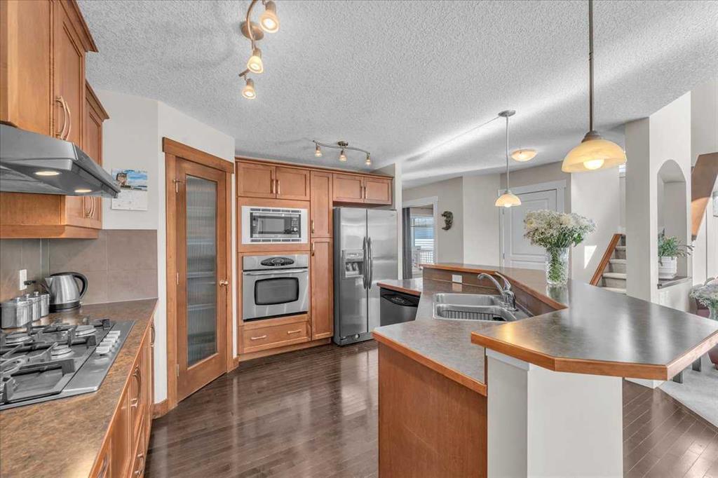 Pride of ownership in this inviting family home in the heart of Cimarron Springs! This home combines space, warmth, and comfort, perfectly designed for growing families. The open-concept layout makes everyday living easy and gatherings memorable, with the kitchen, breakfast nook, and living room all connected in one welcoming flow. The living room has a soaring ceiling and is bathed in sunshine! The cozy gas fireplace becomes a focal paint on those cooler days. The kitchen features rich wood cabinetry, stainless-steel appliances, a gas cooktop, and a breakfast bar, ideal for morning coffee or after-school snacks. A front office with French doors offers a quiet place to work or study, while the practical main-floor laundry keeps the household running smoothly. Upstairs, there are four bedrooms, a must-have for growing families. The spacious primary suite includes a walk-in closet and ensuite with a soaker tub and separate shower. Three additional bedrooms and a full bath complete the upper floor, offering plenty of room for everyone. Downstairs, the large unfinished basement has 2 windows and roughed-in plumbing and is ready for your ideas- two more bedrooms, a family room or a home gym and a bathroom, the basement really is that large! Enjoy sunny afternoons in the south-facing backyard, set on a reverse pie-shaped lot that offers both privacy and play space. Ideally located close to parks, schools, and shopping, this home blends everyday convenience with small-town charm and with flexible possession, you could easily be settled in before Christmas.