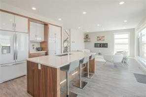 The heart of the home is the stunning kitchen, featuring quartz countertops, custom two-tone cabinetry (walnut lowers and glossy acrylic uppers), a spacious eat-up island, and an elegant backsplash that ties the space together beautifully.