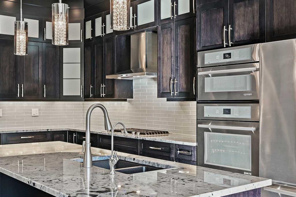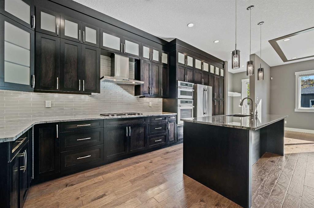 High ceilings on all three levels—including the fully developed basement— and large windows provide natural light for the open floor plans.. The main floor features textured hardwood, detailed millwork, and an architecturally striking open staircase. The gourmet kitchen, finished with granite countertops and rich dark cabinetry includes a full package of stainless Jenn-Air appliances, and dedicated water purification, centering the main level with style and practicality.
