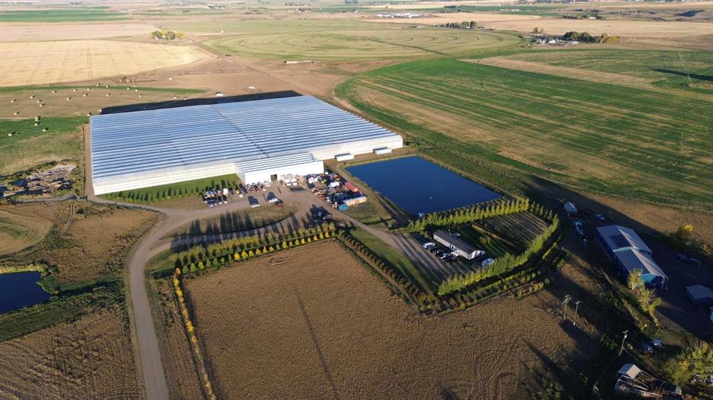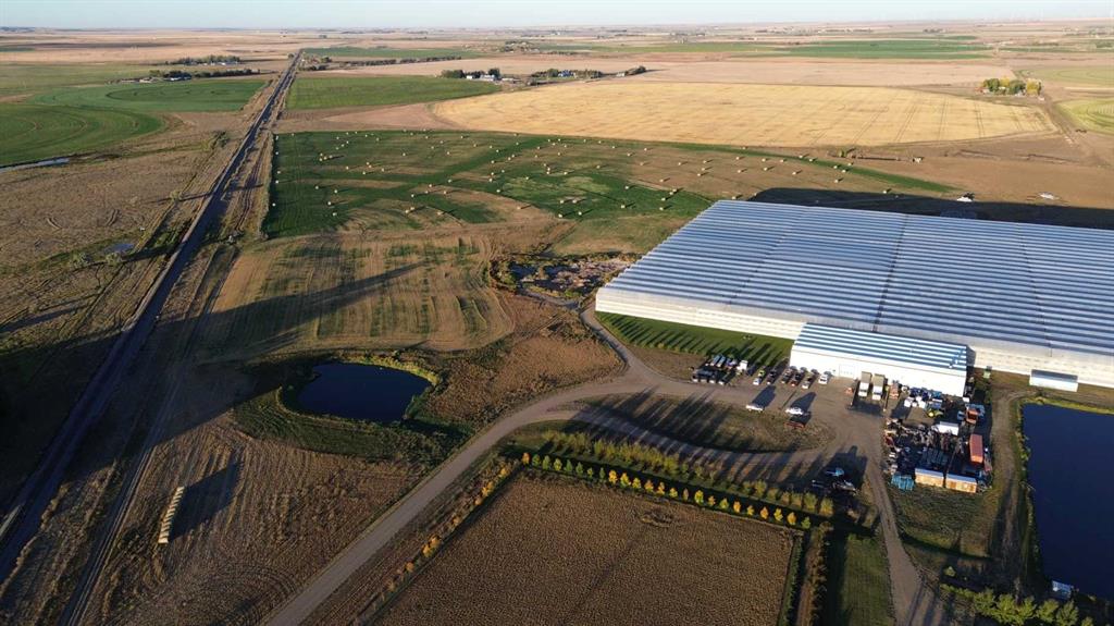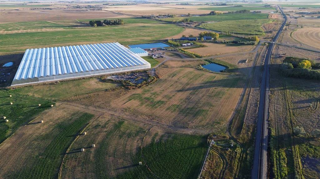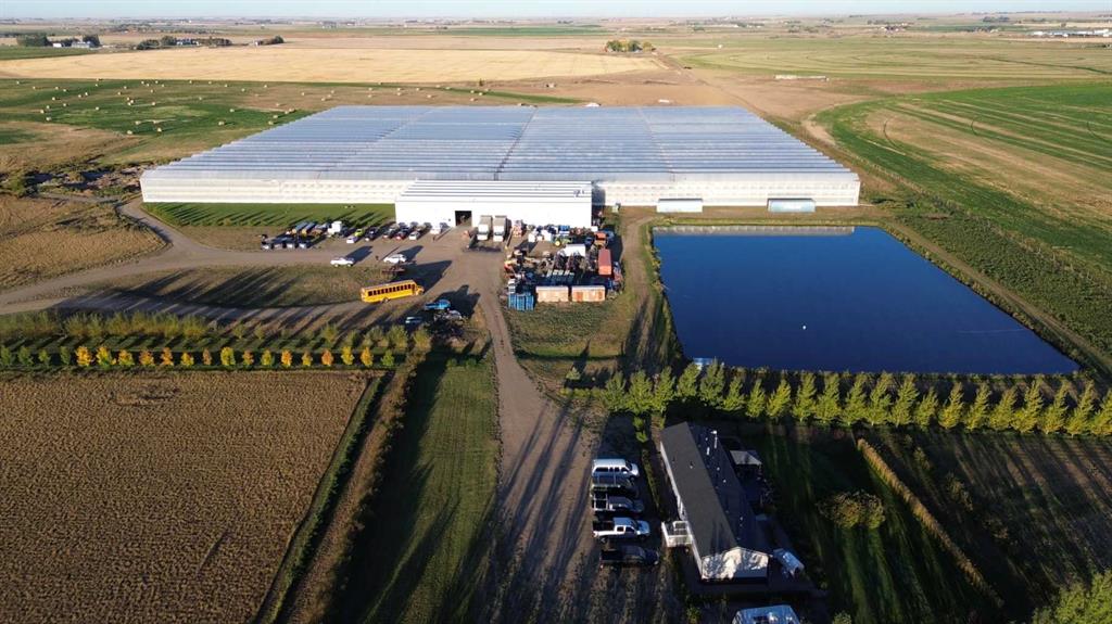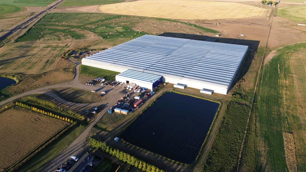 Modern 10-Acre Greenhouse Facility on 93 Irrigated Acres – Near Medicine Hat, Alberta. Outstanding opportunity to acquire a modern, large-scale greenhouse operation located just 15km from Medicine Hat. This 93-acre irrigated property is zoned Horticulture, offering significant room for expansion and future development. The centerpiece of the property is a state-of-the-art 10-acre (419,328 sq. ft.) Venlo-style poly greenhouse featuring 26 bays (24’ x 672’ x 21’ gutter height) designed for efficient, high-output production. The operation is supported by an 84’ x 170’ Venlo shop that houses the boiler and irrigation rooms (separated by glass walls) and includes a fully air-conditioned office, accessible washrooms, lunchroom, and mezzanine—all built to commercial code standards. A 17’ x 11’ walk-in cooler provides additional storage capacity. The water management system is designed for sustainability and efficiency. Rainwater is collected from the greenhouse roof and directed to a 5,000,000-gallon dugout, which is replenished via the SMRID system during summer months to ensure ample supply through the winter. Heating is provided by two 800 HP Crone boilers with Zantingh burners, distributing heat through an integrated pipe and rail system that doubles as transport for electric and hand carts. Key operational highlights include: