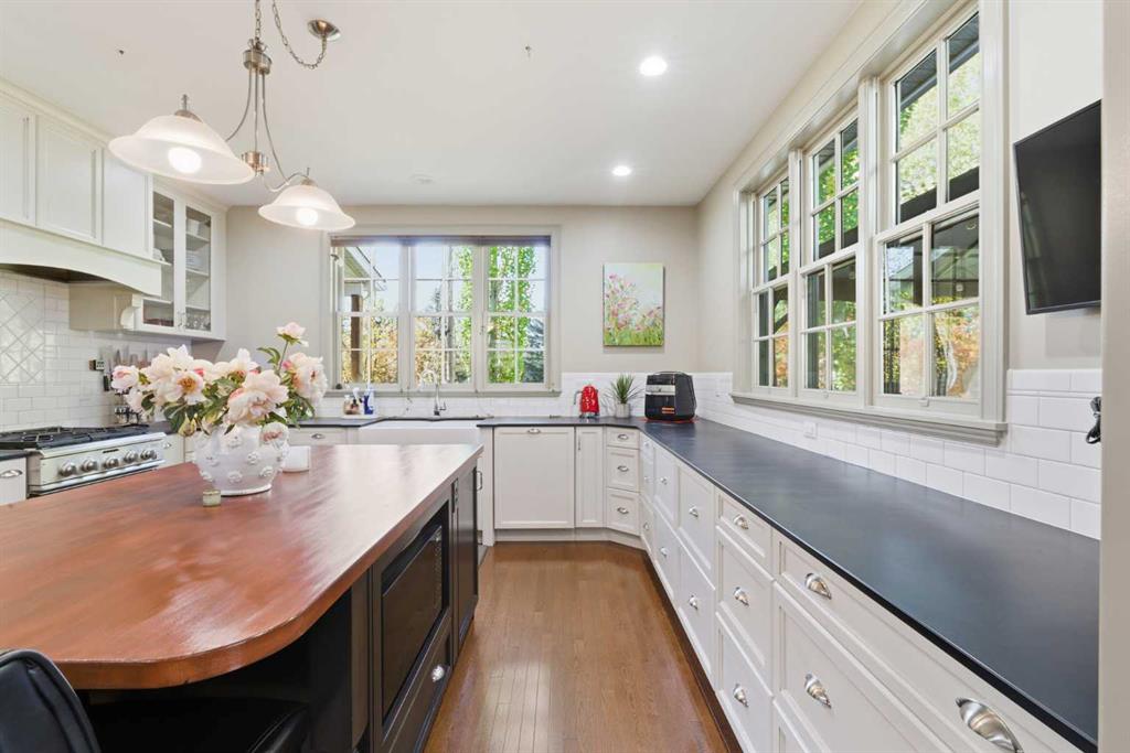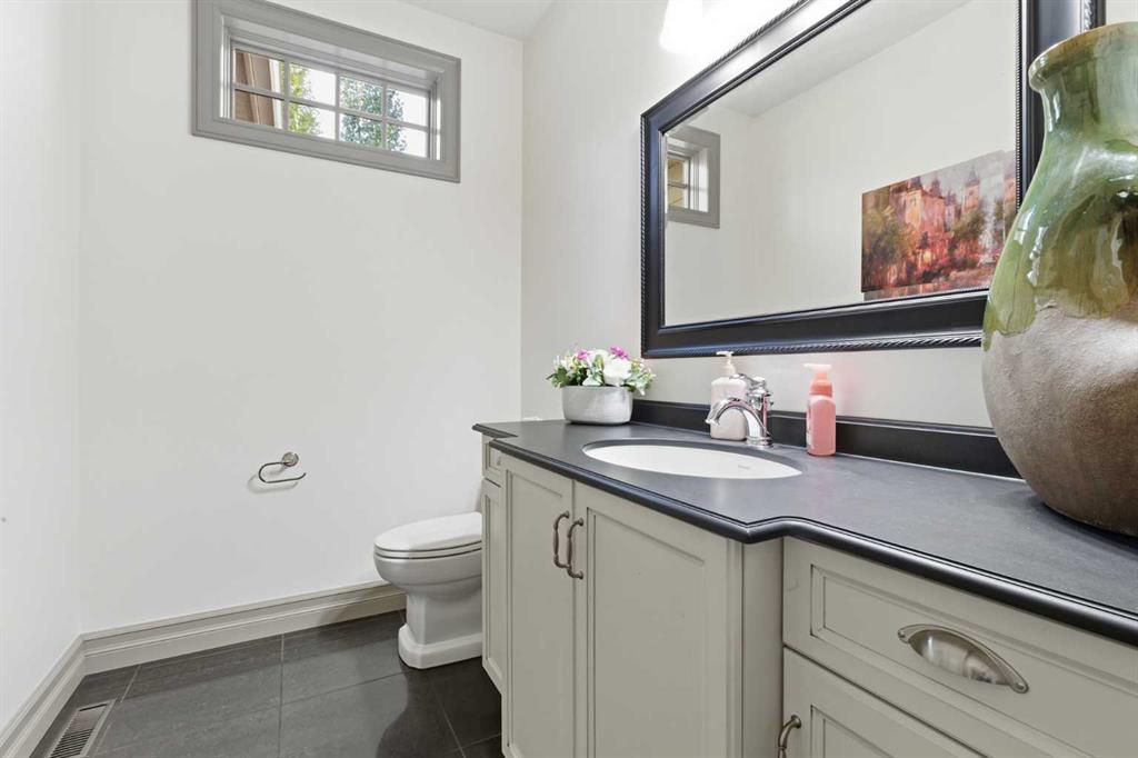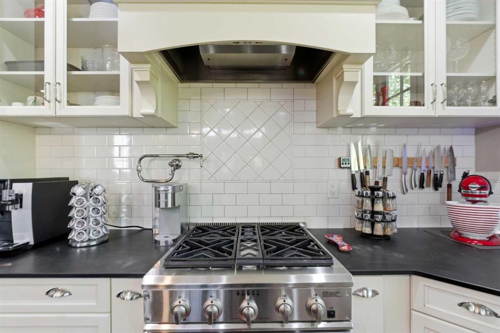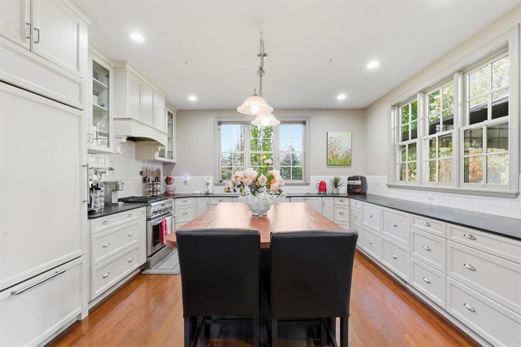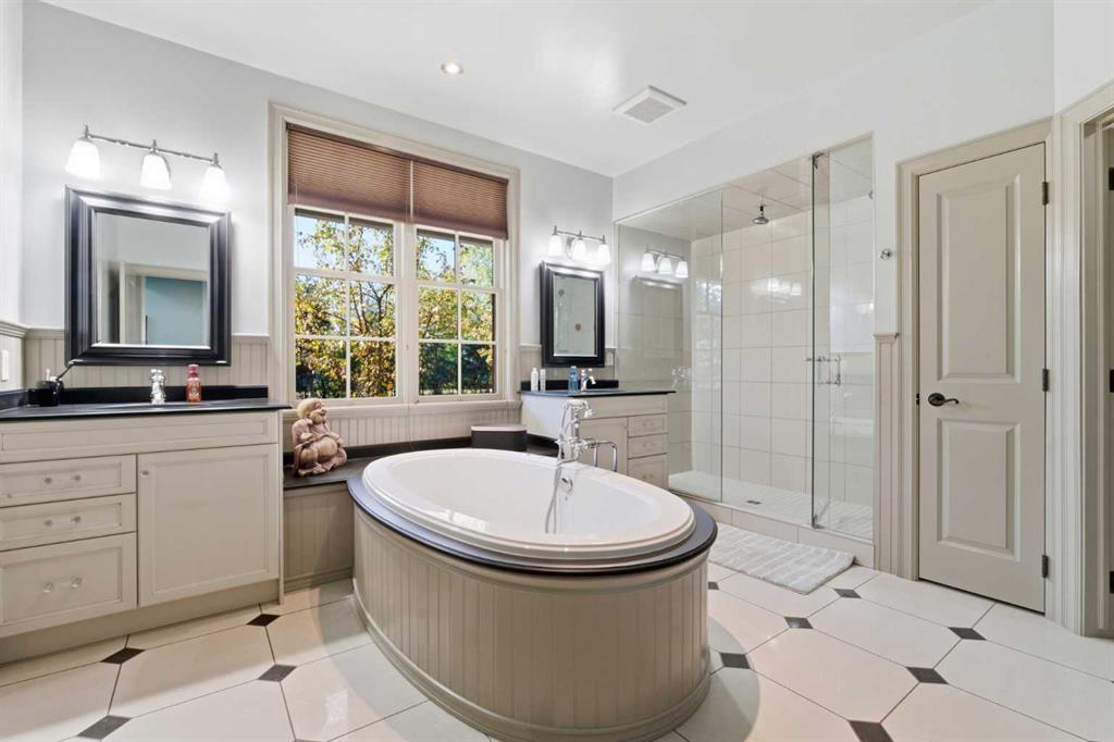 Properties of this caliber rarely come to market. Once part of Rural Rocky View County, this residence now offers the perfect blend of country tranquility and urban convenience—you can walk for coffee yet return home to your own secluded, tree-lined retreat behind an automatic gated entry. The timeless brick one-and-a-half-storey home showcases over 5,050 square feet of refined living space, complemented by a heated oversized double attached garage and an additional heated detached double garage. The main floor spans nearly 2,200 square feet with rich hardwood flooring, classic wainscoting, and an elegant hardwood staircase. The stunning two-toned chef’s kitchen features a butcher-block island, cabinet-paneled refrigerator, gas range with pot filler, and generous windows framing serene treed views. Step outside to the rear deck with a custom gazebo and windscreens—ideal for outdoor dining and relaxation. Every window opens, and each exterior door is equipped with custom Phantom screens, welcoming a natural breeze throughout. The adjacent formal dining room offers the perfect setting for entertaining, while the main-floor laundry with sink adds practicality. The main-floor primary suite is a luxurious retreat, highlighted by vaulted ceilings, direct access to the wraparound teak veranda, and a spa-inspired ensuite with dual sinks, standalone ultra-air tub, steam shower, and heated floors. A second bedroom (or flexible living space) on the main floor boasts vaulted ceilings, abundant natural light, and a cozy gas fireplace. Upstairs, two additional large bedrooms each include walk-in closets and share a charming Jack & Jill five-piece bathroom. The fully developed lower level features a custom wardrobe area, theatre room with projector, fitness space, expansive recreation room, fifth bedroom, secondary laundry, and direct stair access to the garage. The utility room is meticulously designed with hydronic heating, air conditioning, in-floor heating throughout, additional water storage, and ample steel-shelved storage. Outside, enjoy an invisible pet fence, greenhouse, raised garden boxes, and mature trees that create a sense of total seclusion. Experience rural living within minutes of city amenities—this extraordinary Chestermere acreage offers unmatched privacy, comfort, and elegance.