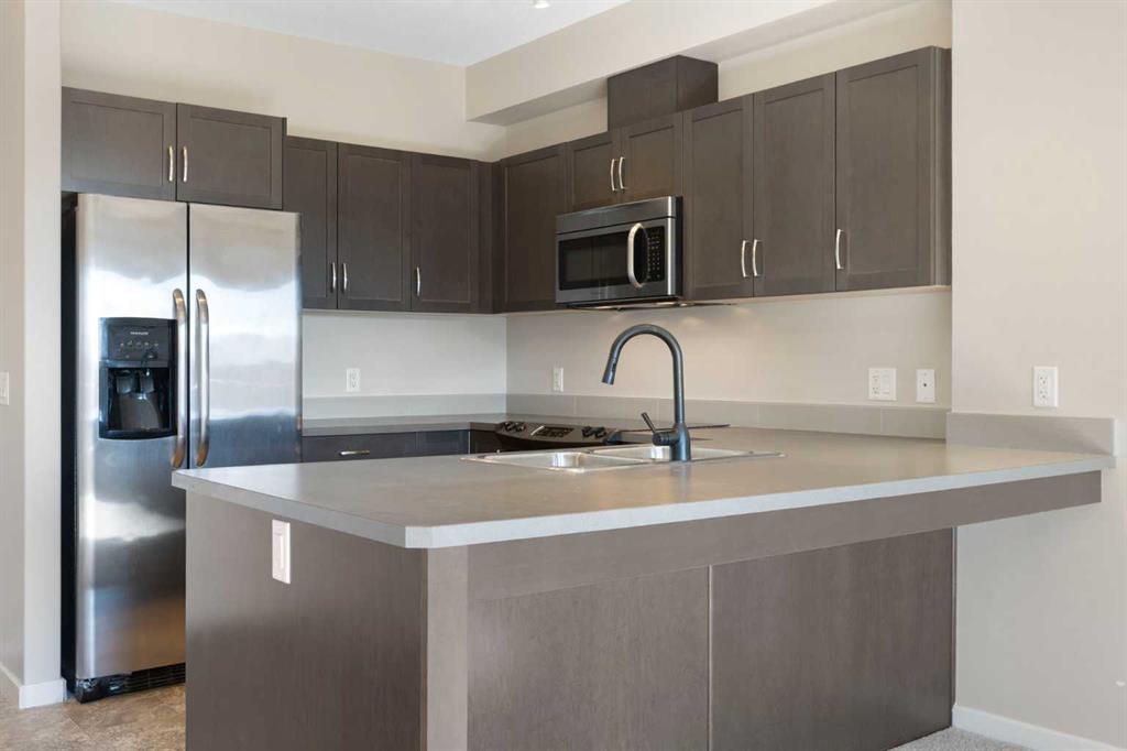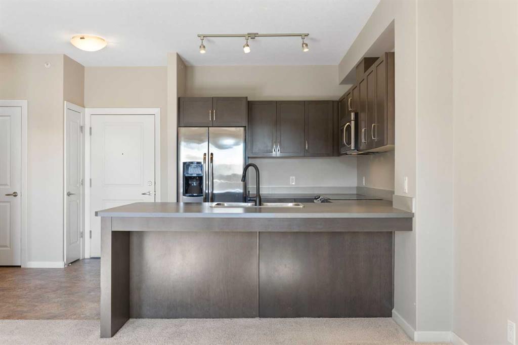 Beautifully maintained top-floor 1 Bedroom + Den in the adult (18+) Kincora Summit. This quiet, well-managed complex offers a calm and comfortable setting with beautifully kept grounds and excellent maintenance throughout. The home features 9’ ceilings, an open layout and 670 sq ft of well designed living space. A standout feature of this home is the large balcony overlooking the courtyard, making it the perfect place to relax or BBQ (gas hookup on balcony) The kitchen includes stainless-steel appliances, a breakfast bar, and plenty of storage. The spacious bedroom offers a walk-through closet and 4-piece cheater ensuite. The den is a great added touch, with sliding glass doors for added privacy. This home Includes one titled underground parking with assigned storage and is conveniently located close to the elevator. Kincora Sumit is close to shopping, restaurants, and major routes.