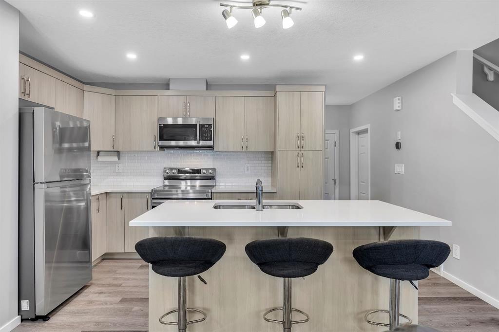 LOWEST-PRICED TOWNHOME IN AIRDRIE WITH 3 BEDS | 2.5 BATHS | DOUBLE CAR GARAGE | NO CONDO FEES – This 2022-built townhome in Southwinds, Airdrie SW offers the ideal combination of space, functionality, and location—with no condo fees and thoughtful design throughout. The home is east-facing, bringing in beautiful morning light through the front windows, while the west-facing private balcony off the primary bedroom lets you enjoy evening sunsets. The main floor features a bright living room at the front, a dining space, and a modern kitchen with quartz countertops, stainless steel appliances, a central island, and plenty of cabinet space. You’ll also find a 2-piece bathroom, a mudroom with built-in shelving, and a front entry closet for extra storage. Upstairs offers three generously sized bedrooms, including a primary suite with a huge walk-in closet, 4-piece ensuite, and direct access to the balcony. Two additional bedrooms, another full 4-piece bathroom, and convenient upper-level laundry complete the layout. The unfinished basement includes plumbing rough-ins for future development. A double attached garage with paved rear lane access, a welcoming front porch, and a family-friendly location close to Windsong Heights School, Chinook Winds Regional Park, playgrounds, and shopping make this a fantastic opportunity in one of Airdrie’s desirable newer communities.