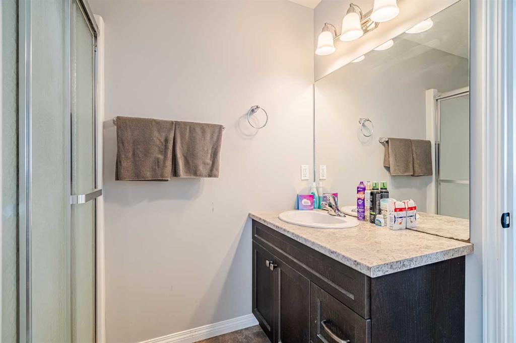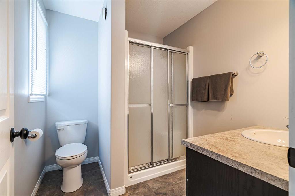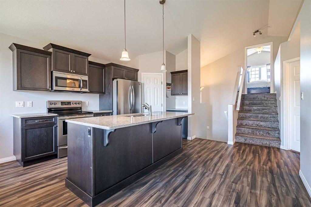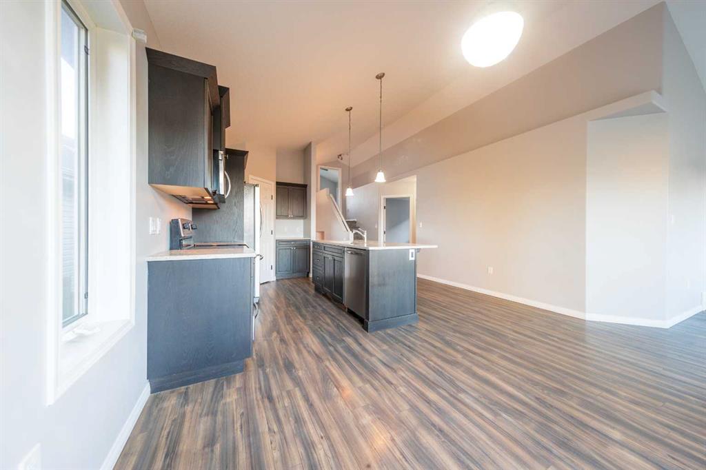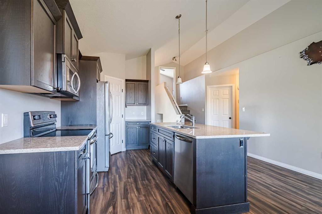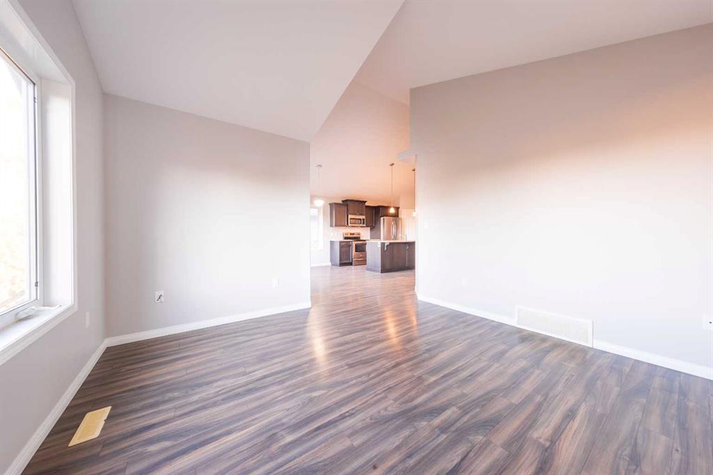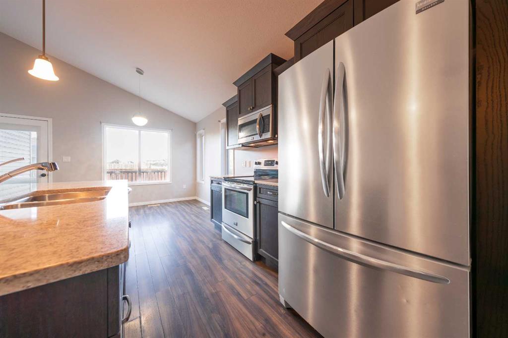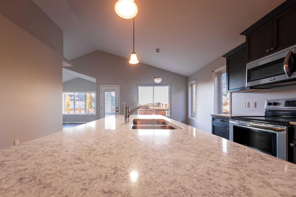 Modified bi-level in the sought after area of Lakeside. 1306 sq. ft. open concept, vaulted ceilings, kitchen with quartz countertops, large island, stainless steel appliances and corner pantry. Rear deck leading to fenced a fully fenced back yard and property backs along a laneway. Finished up and down 3 bedrooms above and 2 in basement. The master ensuite is a double shower and notice the large walk-in closet. Double attached heated garage and double concrete drive. The basement is vinyl flooring throughout. This home is ready for immediate occupancy.