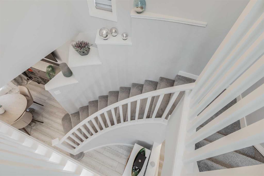 A charming curved staircase leads to the second floor, where skylights and high windows bathe the landing in light. The spacious primary suite features patio doors opening onto a private, covered deck, ideal for morning coffee or evening unwinding. This retreat also includes a walk-in closet and a luxurious five-piece ensuite. Two additional bedrooms, another full bathroom, and a convenient upstairs laundry room with cabinets and countertop complete the upper level.