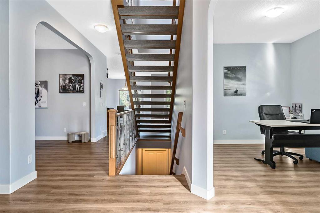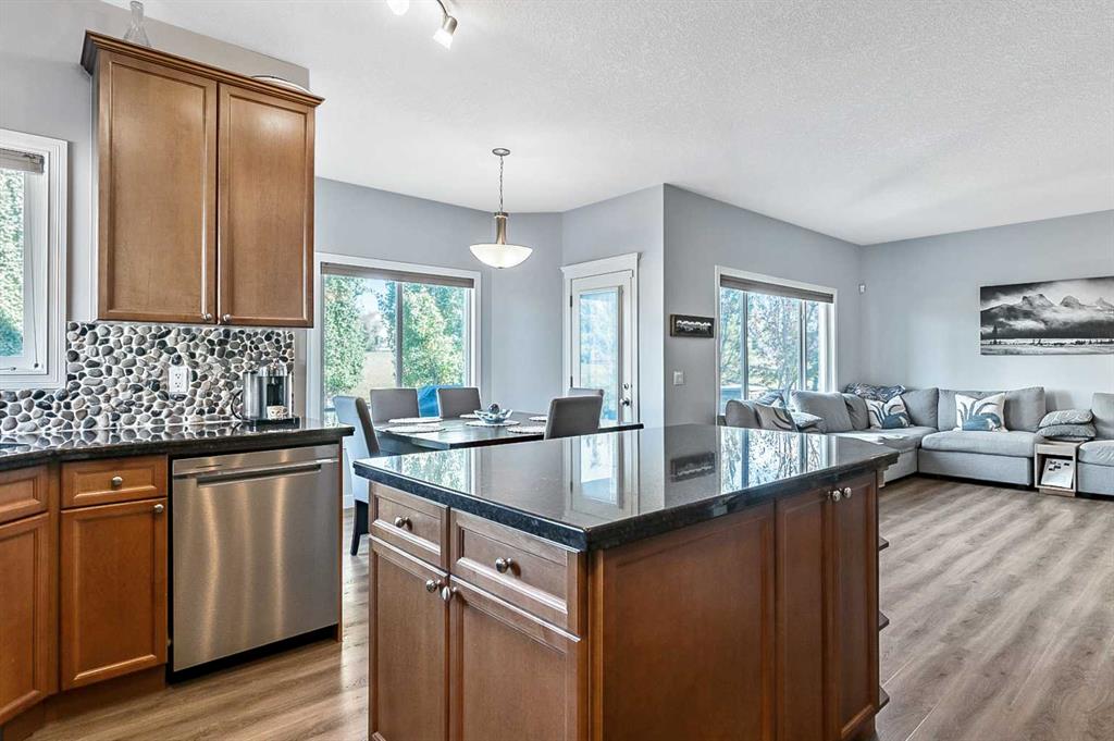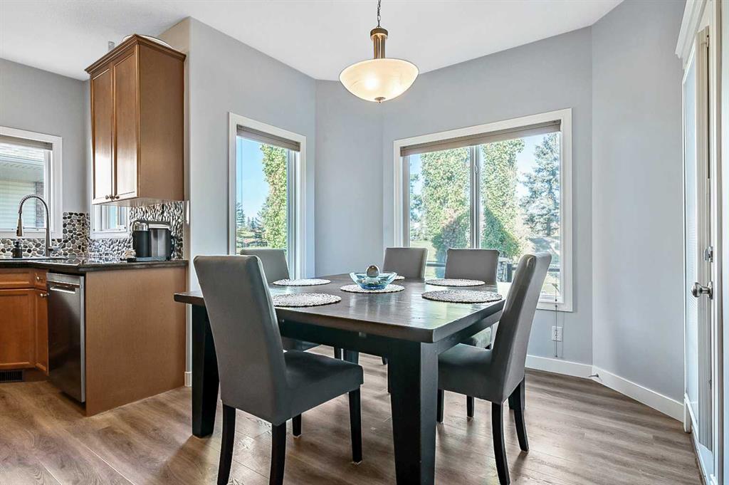 Inside, the open-concept main floor features 9 ft ceilings, a unique open stairwell, and new Vinyl plank flooring. The Classy kitchen is beautifully appointed with granite countertops, solid wood cabinetry and custom Rock backsplash creating a warm and inviting space for family gatherings. The formal dining room off the front entrance provides the perfect setting for entertaining guests. Upstairs, the primary suite is a true retreat, offering a private 5-piece ensuite with a jetted soaker tub, oversized tiled shower with bench seat, and dual sinks. Enjoy quiet moments in the seating nook overlooking the golf course. Three additional bedrooms, all generously sized, complete the upper level. Step outside to a large ground-level deck that spans the full width of the home — ideal for outdoor dining and summer barbecues . The property is fully landscaped front and back and located on a quiet cul-de-sac, ensuring privacy and tranquility. The basement provides endless possibilities to design your perfect space. This is a superb home ideal for your family!