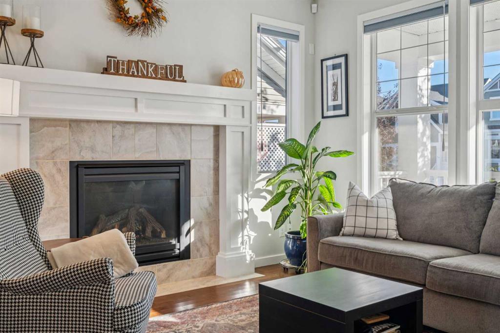 The living room centres around a cozy GAS FIREPLACE with a MANTLE, creating a warm, welcoming atmosphere.