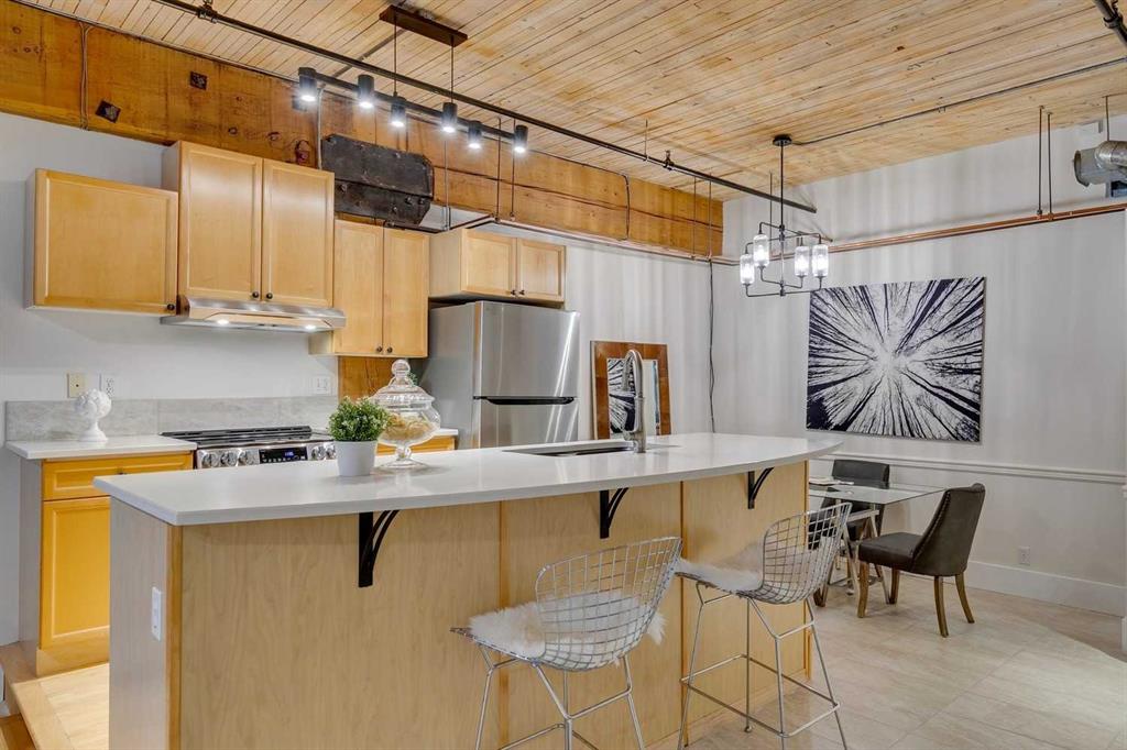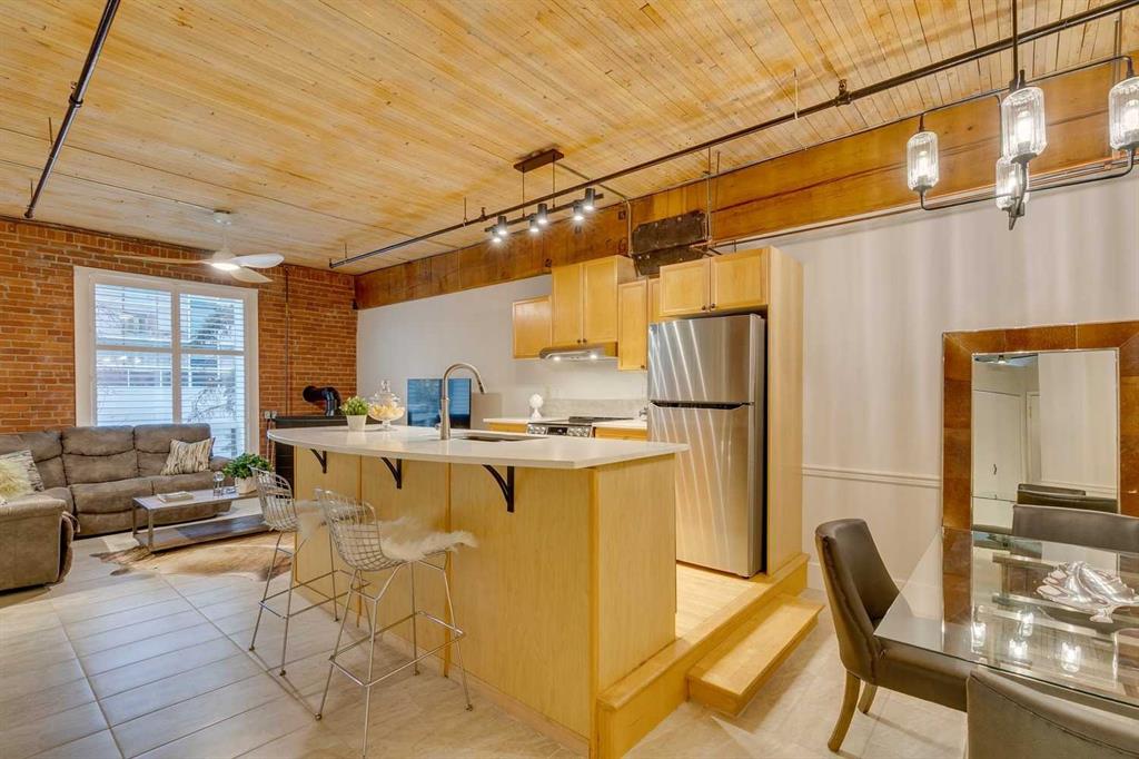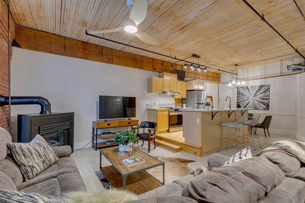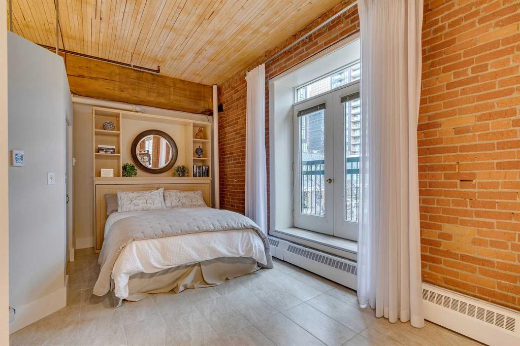 OPEN HOUSE SUN OCT 19, 1-4pm at \"THE HUDSON\" a masterpiece loft, and piece of The Hudson Bay company historic building warehouse converted to loft. LIVE, WORK, & RELAX IN THIS FRESHLY UPDATED UNIT! BRAND NEW ENERGY EFFICIENT LG APPLIANCES, FRESHLY PAINTED , INCLUDING THE UPDATED FIREPLACE. NEW WINDOW COVERINGS, MURPHY BED & QUEEN BED FOR THE CONVIENIENCE OF AN ADDITIONAL BED. DID I MENTION THE LARGE UNDERGROUND HEATED TITLED PARKING?! 1BLOCK UNDER THE BRIDGE SITUATES YOU TO \"THE CORE\" ACCESSING ALL YOUR DOWNTOWN CLIENTS STARTING AT EIGHTH AVENUE PLACE (CONNECTING YOU TO CALGARY\'S +15 AND ALL CORE SHOPPING, MEDICAL, DENTAL, & AMMENITIES. STEPS AWAY FROM LUXURY HOTELS & LOUNGES, TRENDY RESTAURANTS BE IT UPSCALE LUCA & FLEETWOOD , OR ,MORE CASUAL OUTINGS DOWN THE STREET TO RODNEY\'S OYSTER BAR, THAI SAIGON, CRAFT \'ROOFTOP PATIO OR GO BOWLING AT NATIONAL. THIS IS A GEM, IN A QUIET, CLEAN, WELL RAN BUILDING. SET UP YOUR PRIVATE SHOWING TODAY, THIS ONE WILL NOT LAST!