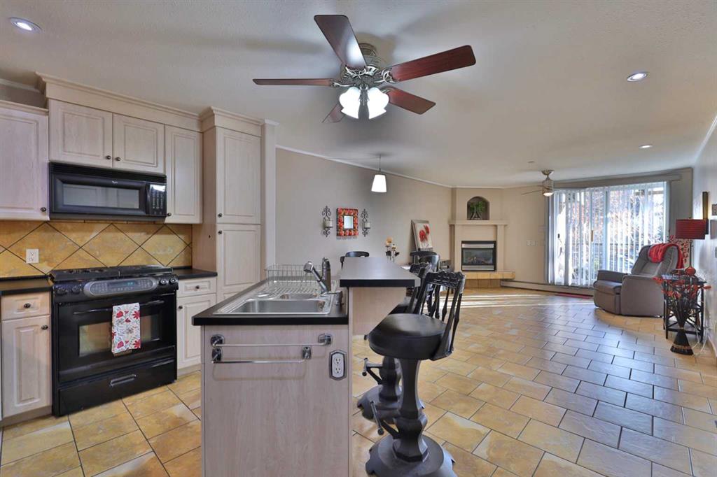 Welcome to Fieldstone Place Condomium and this Lovely 1 Bedroom Suite. Fieldstone is mere steps to all the pathways around Mirror Lake and just a block to all the downtown shopping and festivities. Once you\'re in the Beautiful Building and past the mailboxes, you\'ll find this main floor home. It has a nice open floor plan with just enough neat kitchen cabinetry, handy island, eating area and living room. You can even enjoy the cozy corner gas fireplace on those cool days and appreciate the A/C on the warm ones. From here there are patio doors out to the covered East facing deck, complete with overhead heaters and BBQ gas hook-up. Back inside, you\'ll find the primary bedroom which has double closets, shoe organizer closet and again, access to the East facing deck. Completing the suite is a 3 pc. washroom (w/ walk-in shower and washroom heater) and the laundry space. Again, with neat organizers in the cupboard. You\'ll love that you never have to leave the building to get to your vehicle that is securely parked in the underground parkade as well as the secure storage space. Ohhhh! and when you want a little more space to gather the family, you will LOVE the \"Sunset Lounge\" on the 4th floor with a small kitchen, numerous tables, another fireplace AND a huge West facing deck! Take a look at what carefree condo living can look like! (Building is Adults 55+)