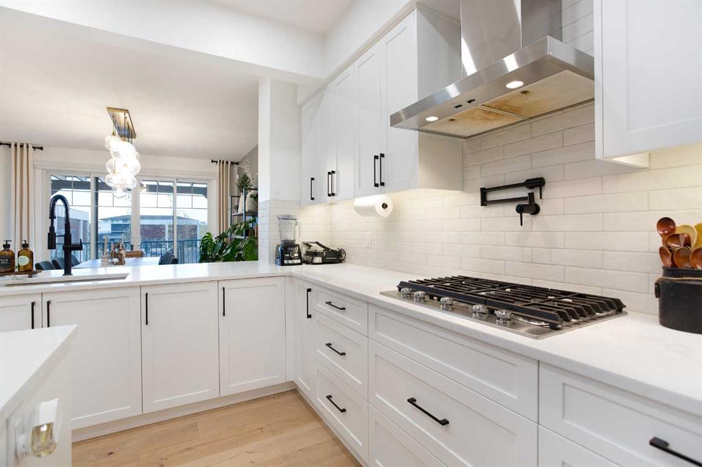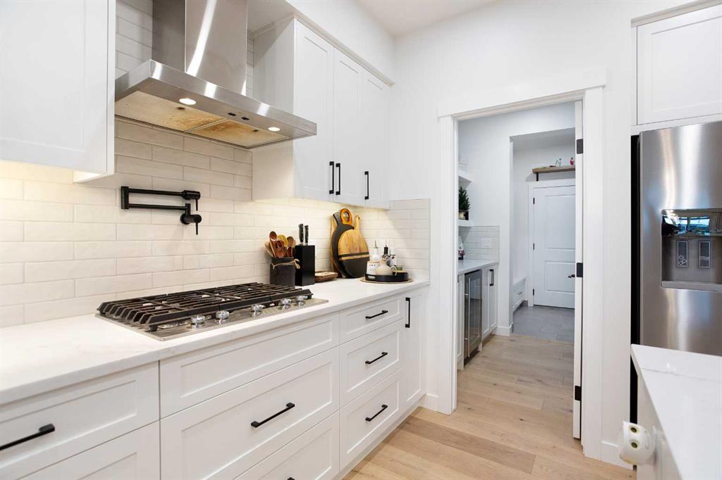 The kitchen anchors the main floor with its clean lines and functionality. Quartz countertops, full-height cabinetry, a gas range with pot filler, and a walk-through butler’s pantry with coffee bar make it a true showstopper for both cooking and entertaining. The living room is defined by a statement fireplace wrapped in shiplap with a solid wood mantel — a warm focal point on cool Alberta evenings.