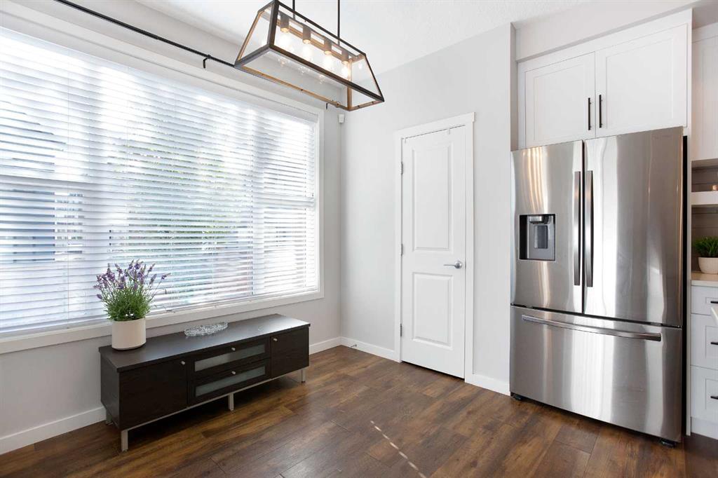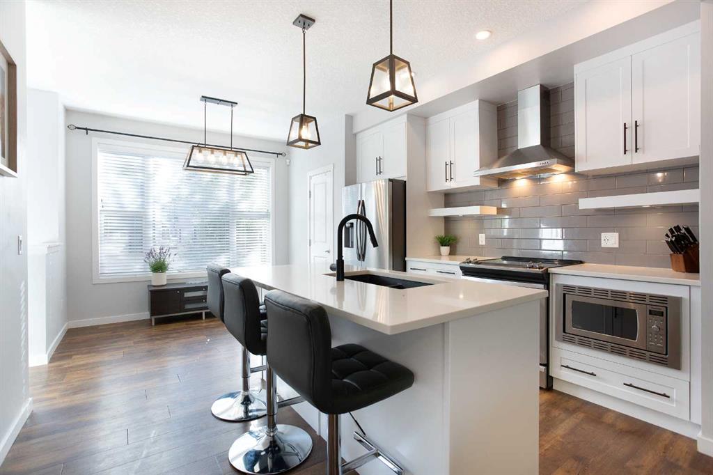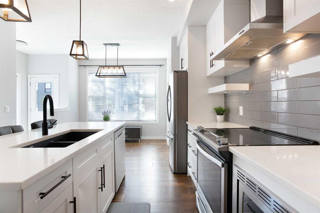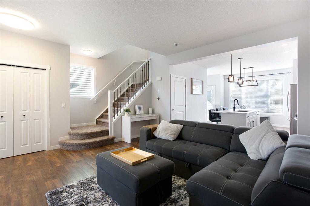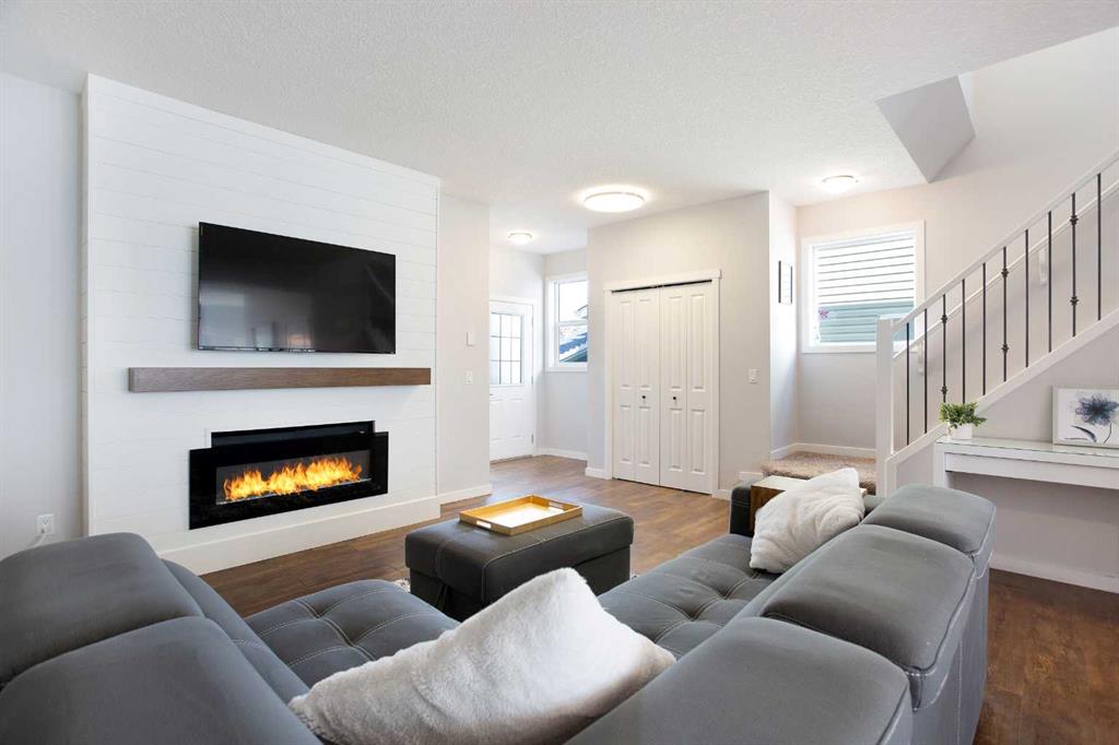 Step into this exquisite, move-in ready duplex nestled in the heart of Airdrie’s prestige Bayside community. Offering superb value with zero condo fees, this attached, two-story home showcases an undeniable pride of ownership across 1,370 sq ft of modern, bright living space. Upon entry, you’ll immediately appreciate the thoughtful design of the main floor, which boasts high ceilings, large windows, and an open-concept layout ideal for both everyday living and entertaining. The spacious living room invites relaxation, featuring a cozy electric fireplace framed by a chic shiplap floor-to-ceiling feature wall. This space opens directly into the stunning kitchen, a true chef\'s delight. It\'s equipped with modern finishes, ample white cabinetry, a convenient pantry, and centered around a magnificent quartz island illuminated by stylish pendant lighting. With clear sight lines, the kitchen seamlessly connects to your bright, contemporary dining area. A conveniently placed two-piece powder room completes the main level. The upper level continues the sophisticated aesthetic, providing a spacious primary retreat—a peaceful sanctuary complete with a walk-in closet and a spotless three-piece ensuite. This floor also hosts two additional great-sized bedrooms, a well-appointed four-piece bathroom, and the highly desirable designated upper-level laundry. Adding fantastic future value, the basement is pre-plumbed and ready for development, offering potential for a fourth bedroom, another full bathroom, or a spacious recreation room. Outside, the property features a single attached garage and a beautifully landscaped, fenced, sunny backyard with a deck and low-maintenance greenery. This home’s prime location is a key highlight, being just steps from the serene waterside pathways and offering easy access to schools, parks, and shopping. Don\'t miss the chance to experience this perfect blend of comfort and community—it\'s truly the ideal place to call home! Book your Showing today!