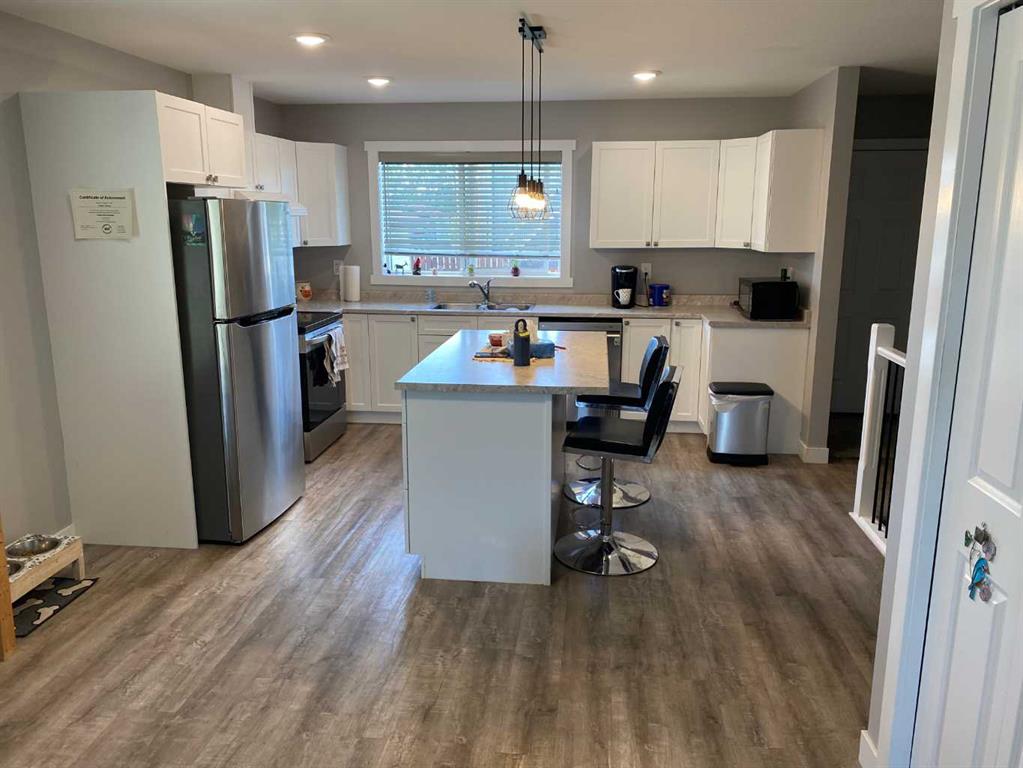 ARE YOU LOOKING FOR A NEW HOME? This 2021 home with concrete basement, and huge concrete parking pads well as a 14 x 24 garage. This beautiful home features 2 good size bedrooms, beautiful bathroom, and a laundry room on the main floor. The primary room has a 2 pc en suite. The Living room is HUGE, and is open to the dining area and kitchen. The bright beautiful, kitchen boasts tonnes of counters and cupboards, and a great island. Down stairs you find 2 very large bedrooms, and an office, also another bathroom and storage, and another huge family room. This home is ready for your family. Close to school as well. The best is that everything is only 3 yrs old