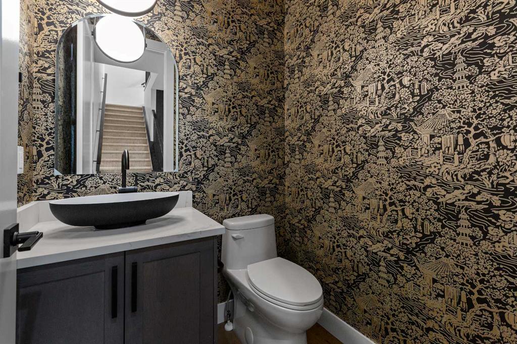 The powder room is a bold design statement, complete with designer wallpaper, a gold leaf ceiling, floating vanity, and backlit mirror — a perfect reflection of modern sophistication.