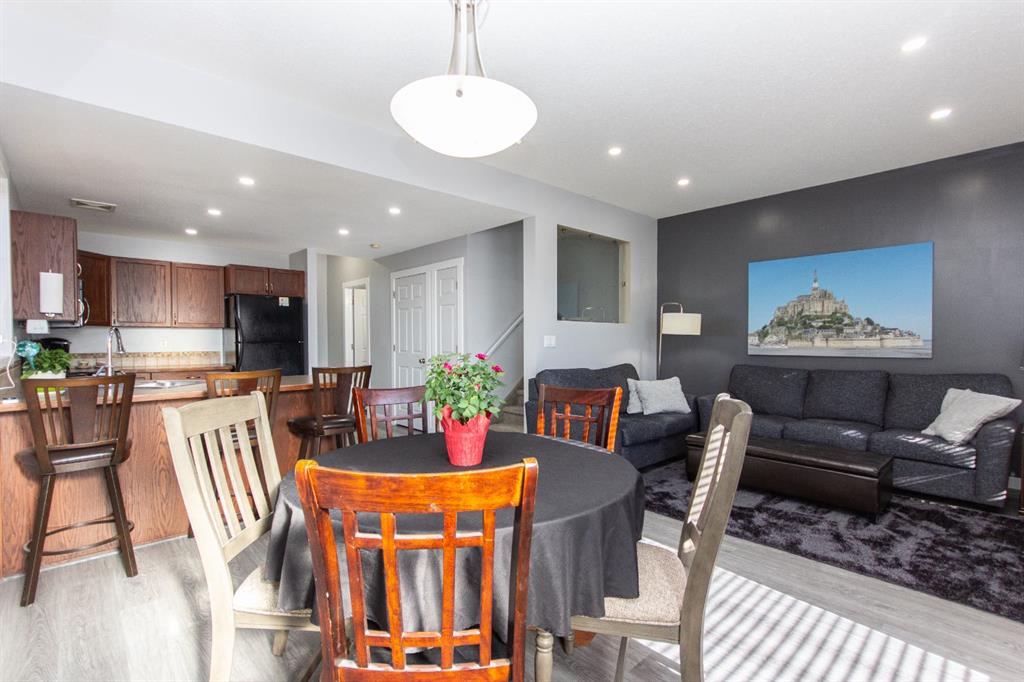 Step inside to a bright and inviting main floor featuring new vinyl flooring, modern paint, and an open-concept design that feels spacious and welcoming. The kitchen showcases rich dark cabinetry, black appliances, and plenty of counter space. It flows seamlessly into the dining and living areas, where large windows fill the home with natural light and create a warm, airy atmosphere.