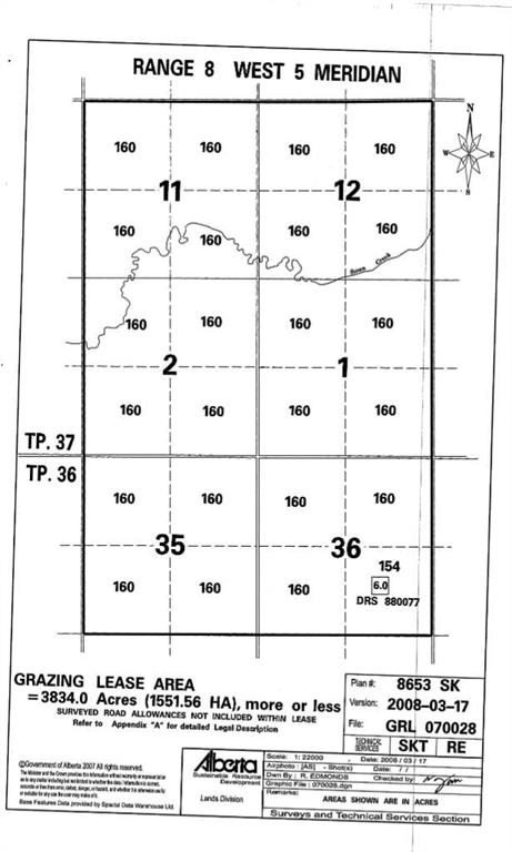 This lease presents an excellent long-term agricultural investment in one of Alberta’s most desirable ranching regions — well-maintained, self-contained, and suited for serious cattle producers seeking scale, water security, and operational continuity in a single block of connected land. LAND INCLUDED AS FOLLOWS W5 35-36-08 NE,NW,SE,SW / W5 36-36-8 SE,SW,NE,NW / W5 01-37-08 NE,NW,SE,SW/ W5 02-37-08 SE,SW,NE,NW / W5 11-37-08 SE,SW,NW,NE / W5 12-37-08 SE, SW,NE,NW