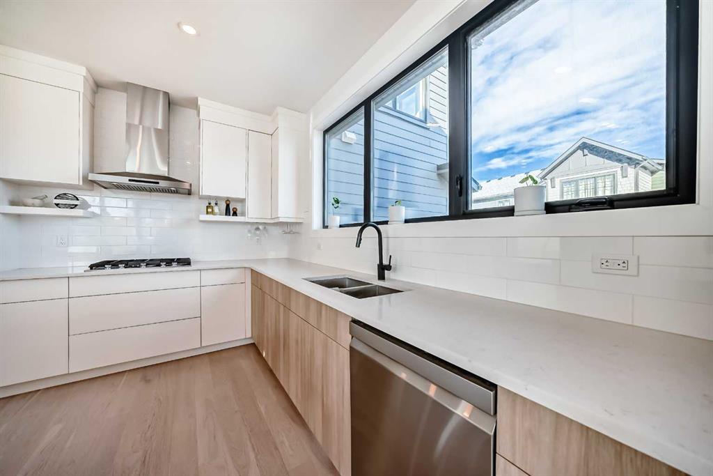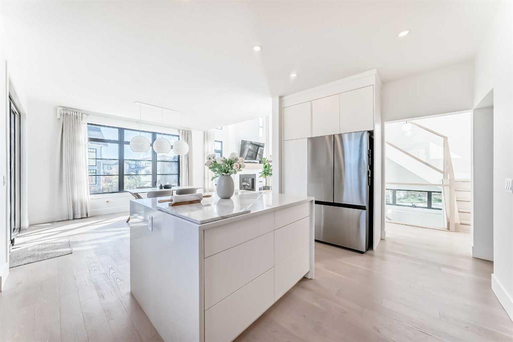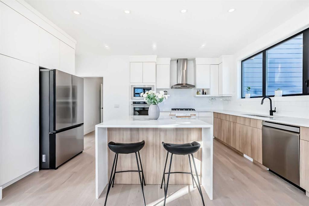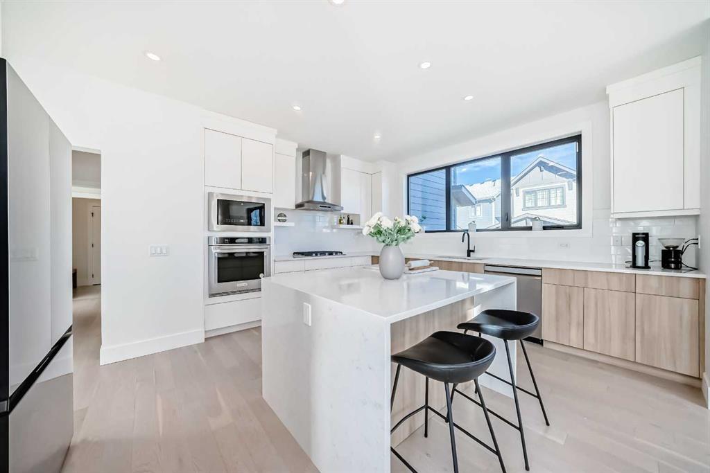 Step into a gorgeous 2-storey living room with a gas fireplace and oversized South-facing windows bringing in tons of natural light. Bright dining area with plenty of space for a large table. The beautiful kitchen offers pristine full height white cabinetry with some wood tone lower cabinets, a large central island with waterfall quartz counters on two sides, upgraded stainless steel appliances with a built-in wall oven, built-in microwave, and countertop gas stove. Very easy to clean with push open cabinets and drawers, and lots of counterspace for prep! Whistler quartz counters throughout the home. Bonus walk-through pantry and butler’s pantry leads straight to the mudroom and rear attached double garage with an 8 ft door. A private 2-pce bathroom completes the main floor.
