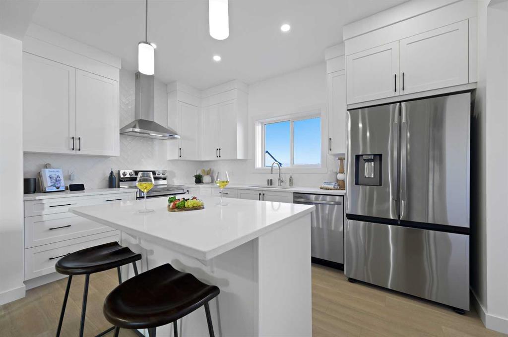Luxury Meets Lifestyle in the Heart of Keystone Creek | The Orchid by Genesis Builders Group. Experience elevated living in this stunning Orchid model, a 1,756 Sq.Ft. laned home crafted by the award-winning Genesis Builders Group, with possession set for September 2026. Designed with modern elegance and functionality in mind, this home is built ready for a legal basement suite (subject to city approval)—featuring a separate side entry and 9’ foundation, offering endless possibilities for future income or multi-generational living. Step inside to a bright and welcoming foyer highlighted by an 18” x 36” picture window and a main floor flex room flooded with natural light. The open-concept living, dining, and kitchen area is perfect for both everyday living and entertaining. The chef-inspired kitchen boasts premium Samsung stainless steel appliances—including a slide-in glass top range, double-door refrigerator with water dispenser and dual freezer drawers, built-in microwave, and dishwasher. Beautiful sparkling quartz countertops, full-height upper cabinets, and soft-close doors and drawers elevate the space, while the centre island with bar seating creates a warm and social hub for family and friends. A convenient mudroom leads to the rear deck, complete with a built-in BBQ gas line—ideal for summer gatherings and outdoor dining. Upstairs, you’ll find three spacious bedrooms, all featuring plush carpet flooring. The primary bedroom is a true retreat, complete with a walk-in closet and a luxurious 4-piece ensuite featuring dual vanities and a walk-in shower. Bedrooms 2 and 3 share a well-appointed 4-piece bathroom with a tub/shower combo, and the upper-level laundry room adds everyday convenience.