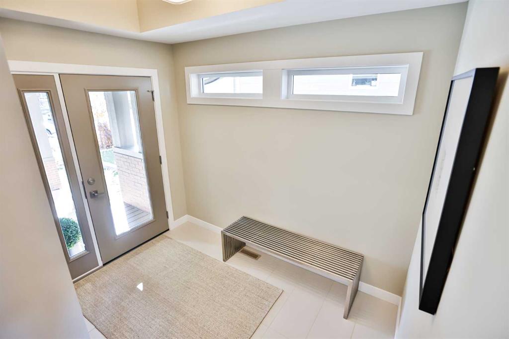 An extra-wide staircase with photo-sensor lighting leads to the upper level, where 10-foot ceilings in the bonus room and a skylight flood the space with natural light. Two spacious front bedrooms, a large main bath, and second-floor laundry add everyday convenience. The primary suite is a true retreat, set apart by a custom glass-railed staircase and modern crown molding with pot-light detailing. A walk-in closet and two custom built-ins provide abundant storage. The spa-inspired ensuite features a double floating vanity, water closet, exquisite glass-tiled shower with dual heads, and heated floors for year-round comfort.