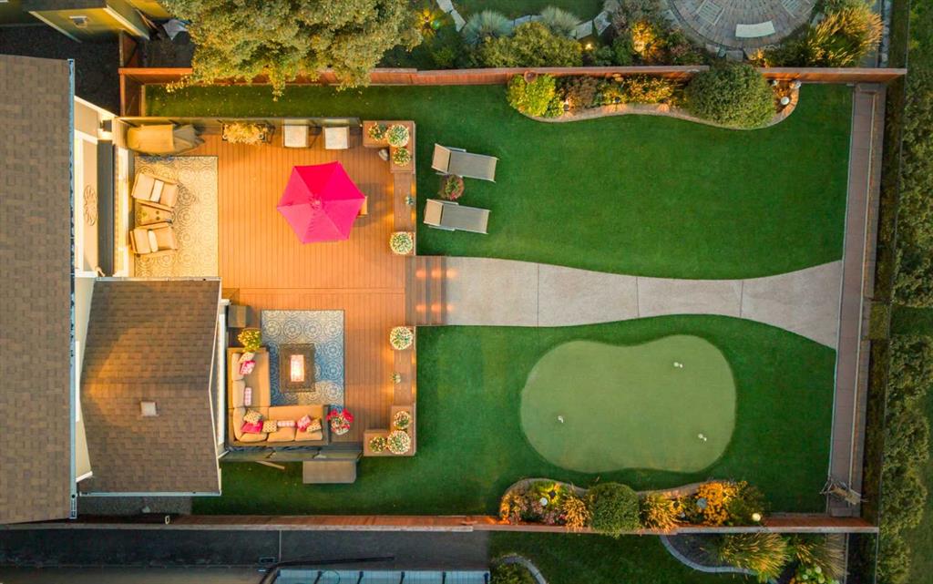 The BACKYARD is designed for YEAR-ROUND ENJOYMENT with PROFESSIONAL LANDSCAPING, an EXTRA-LARGE COMPOSITE DECK WITH GLASS PRIVACY PANELS, ARTIFICIAL TURF, and a PRIVATE PUTTING GREEN, offering a LOW-MAINTENANCE, FUN OUTDOOR LIFESTYLE.