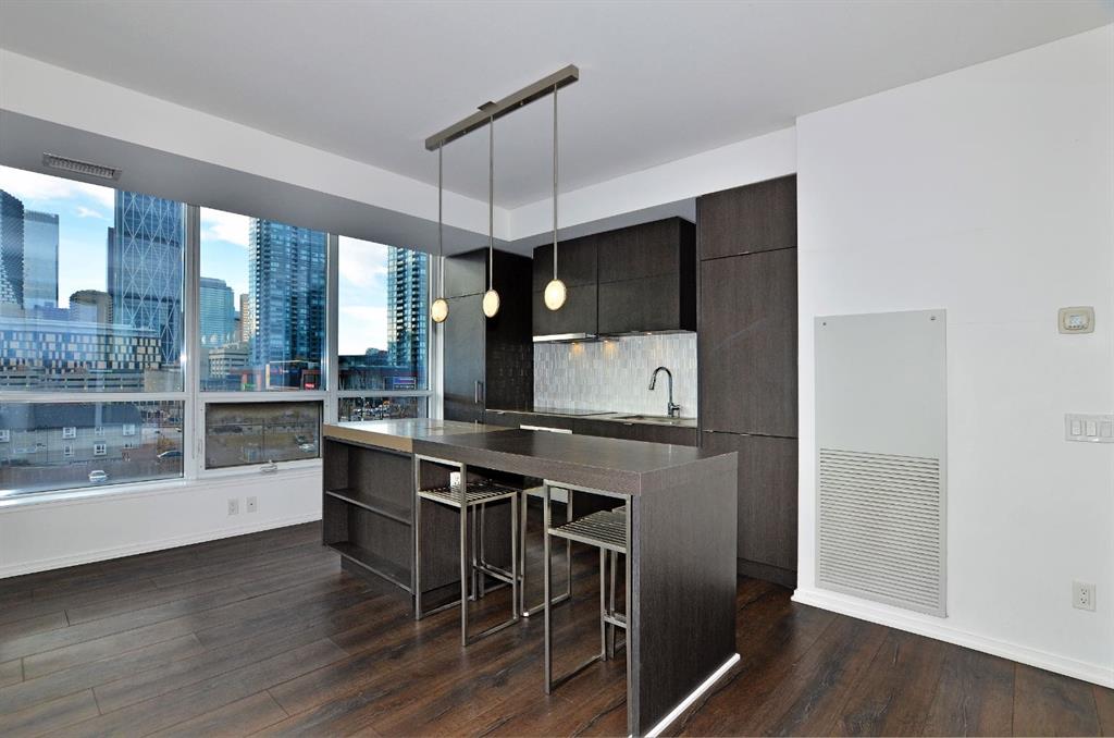 Welcome to Verve in East Village, one of Calgary’s most sought-after addresses combining modern design, urban energy, and incredible views. This 2-bedroom, 1-bath home offers 180° panoramic views of downtown and the Confluence Historic Site, where the Bow and Elbow Rivers meet. Floor-to-ceiling windows fill the space with natural light, and the open-concept layout connects the kitchen, dining, and living areas seamlessly, making it perfect for both relaxing and entertaining. The modern kitchen features sleek cabinetry, quartz countertops, and built-in appliances, while the home also includes central A/C, in-suite laundry, and a private balcony to take in sunrise and sunset views over the city. Adding even more value, this rare unit comes with two titled underground parking stalls plus three titled motorcycle stalls. Verve offers premium amenities including a rooftop lounge and terrace, fitness center, guest suites, and concierge service, all just steps from the RiverWalk, Central Library, cafes, and the CTrain. It’s downtown living with a riverside vibe — and a truly unique opportunity to own one of the most distinctive homes in the building. All stalls are rented out and returning big cashflow returns, property also includes a storage locker.