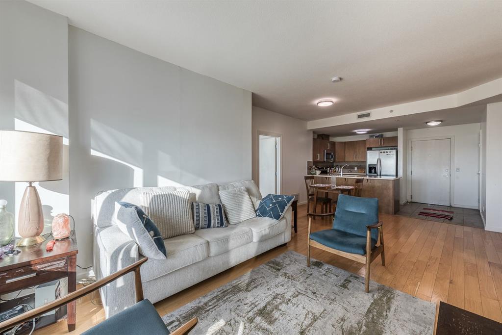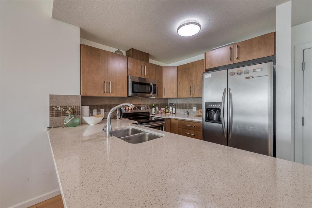 Urban Living at Its Best! Welcome to Vetro, where modern style meets unbeatable convenience. This 20th-floor, 2-bedroom, 2-bathroom condo offers panoramic south-facing views and an open, light-filled layout you’ll love coming home to. The kitchen features ample cabinetry, sleek quartz countertops, and a seamless flow into the dining and living areas — perfect for entertaining or simply relaxing with breathtaking city and mountain views. The split-bedroom design provides ideal privacy, while floor-to-ceiling windows bring in stunning natural light day and night. Enjoy the spacious balcony with gas hookup, in-suite laundry, titled underground parking, and assigned storage locker. Residents enjoy exclusive amenities including a fully equipped gym, hot tub, sauna, theatre, rooftop patio, entertainment room, and full-time concierge and security. Located steps from LRT, Stampede Park, the new Scotia Place Event Centre, Saddledome, downtown offices, and vibrant local shops and restaurants, this is the ultimate walkable lifestyle. All this with affordable condo fees of only $580/month, including underground parking and storage. Whether you’re a young professional, investor, or downsizer, this condo delivers high-quality living, unbeatable views, and exceptional value in one of Calgary’s most desirable urban towers.