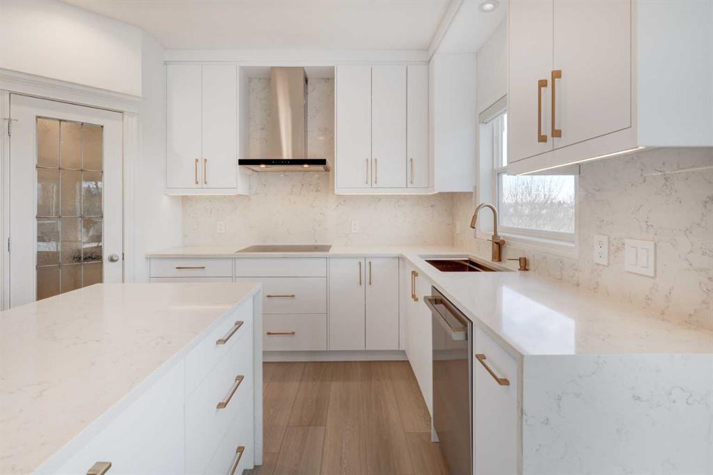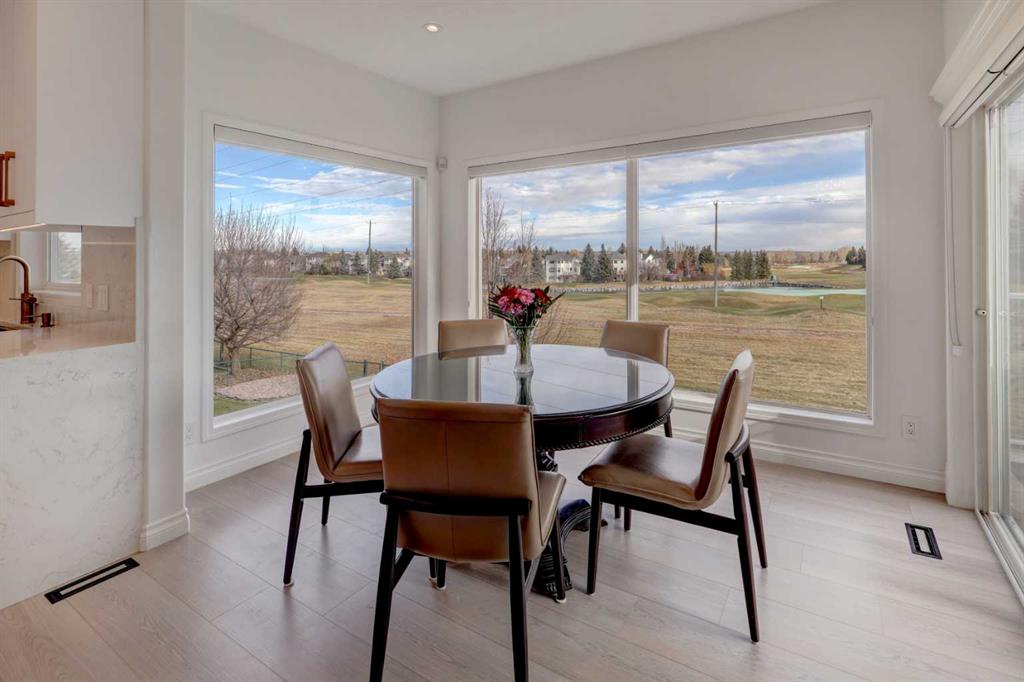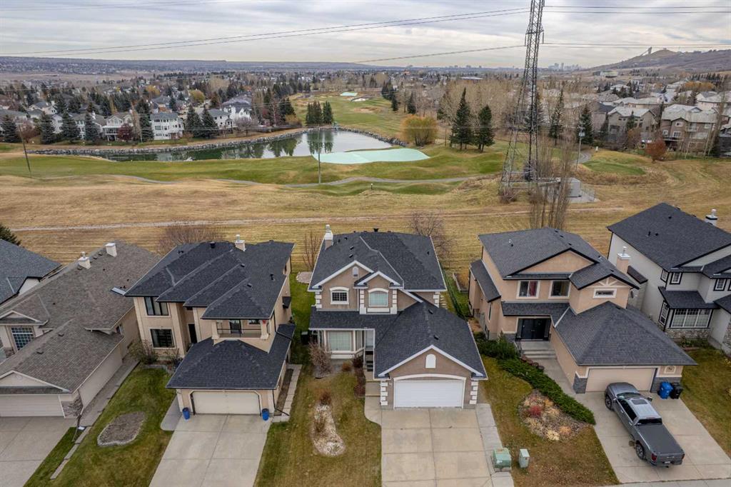 Welcome to this breathtaking 3700+ sq ft beautifully renovated detached home perfectly positioned on one of the most desirable lots in Valley Ridge, backing onto a serene green belt and the Valley Ridge Golf Course and pond. Enjoy sweeping, unobstructed views of the fairways, water features and morning sunrises that fill the home with natural light. This home has 4 large bedrooms, 3.5 bathrooms, main floor study/flex room, and has been extensively updated to combine modern elegance with timeless comfort. Notable renovations include: a fully redesigned kitchen with new custom cabinetry, quartz countertops, and premium built-in appliances including wall oven, microwave, cooktop, dishwasher, and a custom hood fan. Brand new carpet on the upper level and stairs, luxury vinyl plank flooring throughout the main floor, fresh paint across the entire home, designer lighting upgrades, including statement chandeliers in the foyer and dining area, new pot lights for bright, even illumination, a modernized fireplace with a sleek quartz surround, new upper-level windows and a newer roof for added peace of mind.