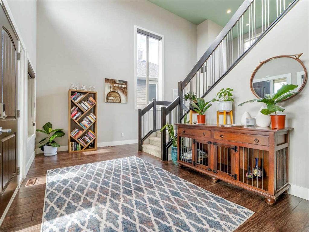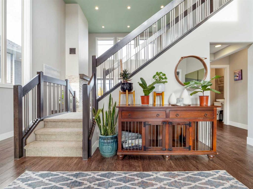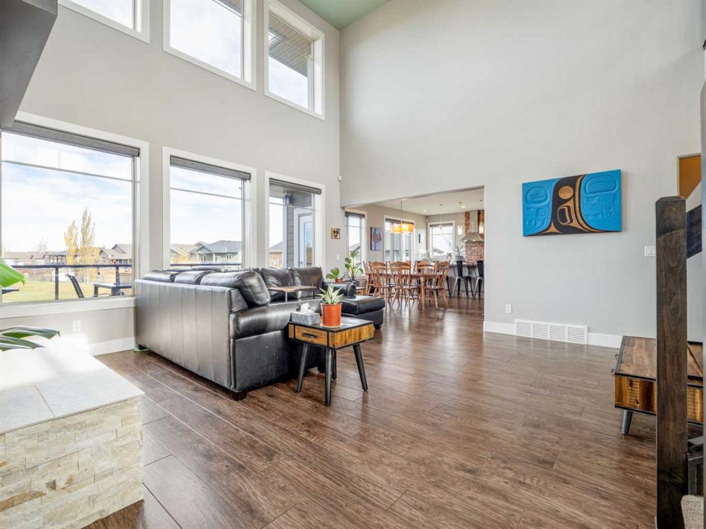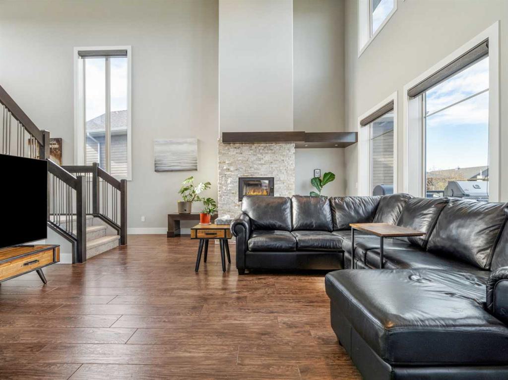 If you are looking for a home that gives you a WOW factor the minute you walk in the door, look no further. Upon entering this gorgeous home you will notice the grand central staircase as well as the towering 22 foot ceilings and the huge windows that reach to the top of the ceiling. This amazing home backs a greenspace as well as it has a greenspace to the one side so you only have one set of neighbors on the west side. You will appreciate the huge deck overlooking the back yard and large greenspace, as well as the walk out basement this home offers. On the main floor you have a beautiful white stone wood burning fireplace, as well as a modern and sleek kitchen with concrete countertops and stainless steel appliances and the fridge was just purchased within the past year. As you enter from the oversized 26 x 25 garage perfect for even the largest trucks, you will find hanging lockers for all the kids boots and jackets as well as main floor laundry and a generous closest and panty. Upstairs via the grand central staircase you will find 3 bedrooms a full 4 piece bath and a lovely ensuite bath off the master bedroom. Downstairs you will find an additional three bedrooms, a family room with a gas burning fireplace and walk out basement that previously had a hot tub so the wiring is all still in place if you wish to bring your own. You will also find a storage room and another full 4 Pc bath perfect for the teenagers downstairs. If you are looking for room to park your RV the front driveway is so large you could fit the RV to one side and still have room to park multiple cars. Other great features of this home are the underground sprinklers, new concrete curbing around the trees and shrubs, Central air, wet bar downstairs, and all appliances including the washer and dryer are included. Don\'t delay homes like this don\'t come up to often!