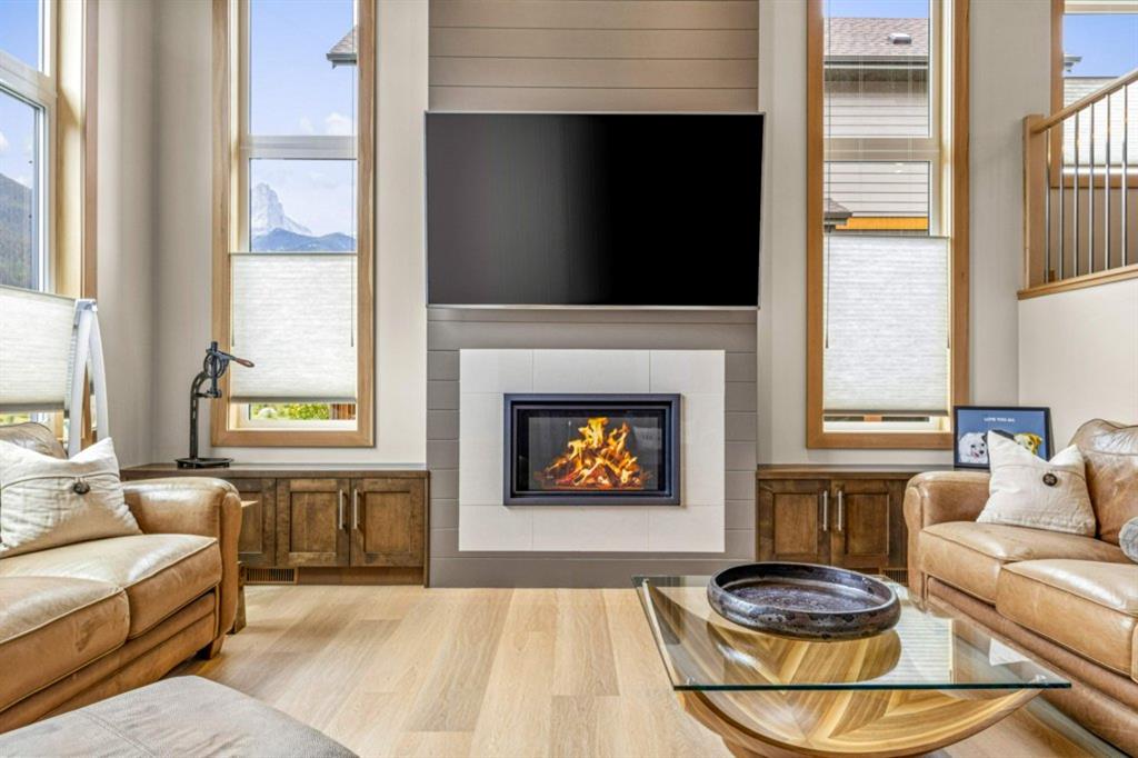 Adjacent to the renowned Stewart Creek Golf Course, this remarkably upgraded mountain-modern home captures the essence of Canmore living. Vaulted ceilings, expansive windows, and 180° exposure flood the 1,850SF space with natural light while framing breathtaking mountain views. Thoughtful design details run throughout, including a custom wood ceiling, stained cabinetry, open-riser stairs, and striking wood beams. The chef’s kitchen showcases premium built in appliances (including a 6 burner gas cooktop), large quartz island, and direct access to a massive west-facing wraparound deck with a BBQ gas hookup—perfect for morning coffee or evening sunsets. From the kitchen, look out over the inviting family room, where a statement gas fireplace anchors the south-facing living space. Upstairs, the serene primary suite features a picture-frame window with views of the iconic Third Sister, a private ensuite with double sinks, and a generous walk-in closet. Two additional bedrooms and a 4-piece bath complete the upper level. The versatile lower level includes a fourth bedroom or flex space ideal for a media room, home office, or fitness area, along with a third full bath. The heated double garage offers epoxy flooring, a slatted wall organizing system, and ample gear storage—perfect for outdoor enthusiasts. Additional upgrades include hardwired speakers, a hot tub rough-in, EV charging rough-in, custom pantry shelving, built-in cabinetry, and low-maintenance landscaping.