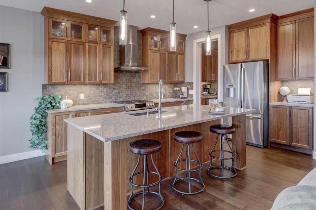 Step inside to soaring 9’ ceilings, 8’ doors, and wide-plank engineered oak hardwood throughout the open-concept main floor. The gourmet chef’s kitchen impresses with an oversized granite island, full-height custom walnut cabinetry, gas cooktop, electric oven and Bosch microwave. A walk-through Butler’s Pantry leading to a thoughtfully designed mudroom and oversized garage with epoxy floors. Stylish gemstone lighting adds a touch of elegance and curb appeal to the home.