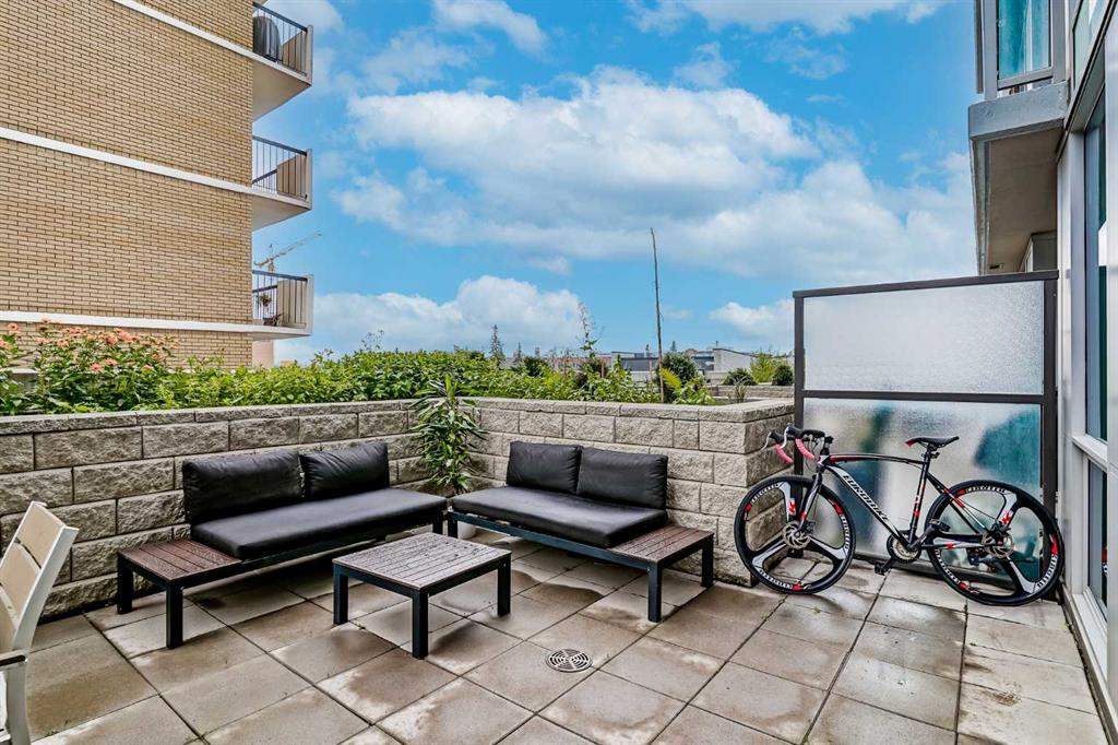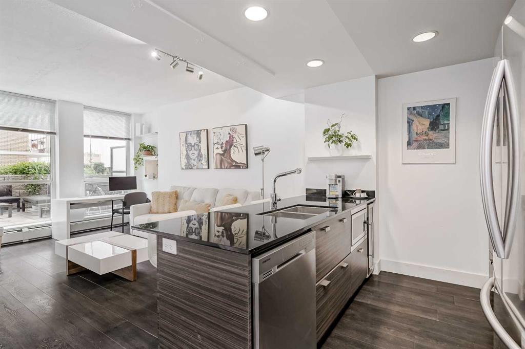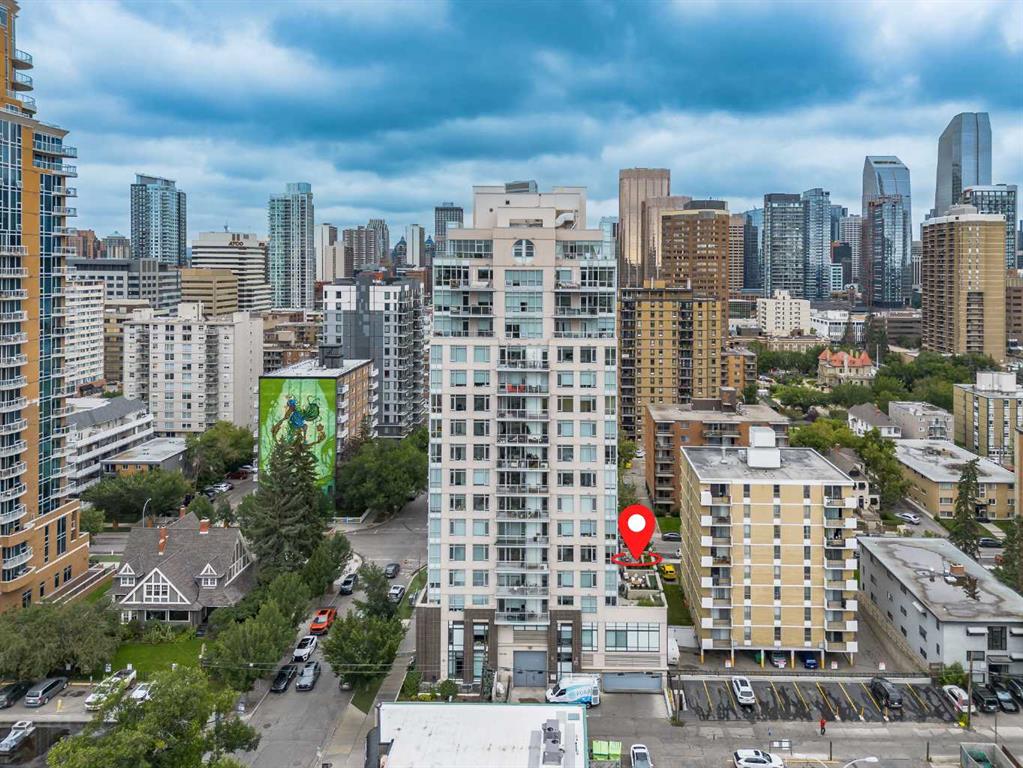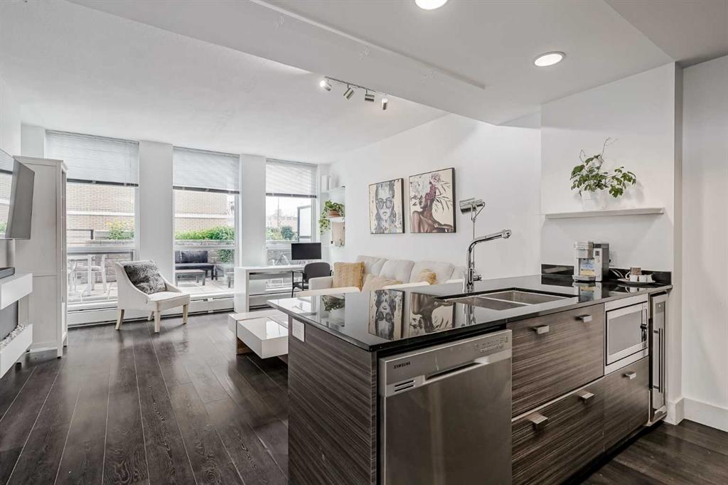 Welcome to this gorgeous 1 bedroom, 1 bathroom condo in one of Calgary\'s most desired buildings, The Drake. This home really does have it all with 492 square feet of living space and an ABSOLUTELY MASSIVE TERRACE. As you walk in you are greeted with beautiful dark wood floors throughout the home starting with your kitchen, equipped with stainless steel built-in appliances, glass cook-top, granite counter tops, and a eat up bar area. Your kitchen flows into your living room making for a perfect entertaining space and is wrapped with floor to ceiling windows overlooking your expansive terrace. Your bedroom is large enough for all of your bedroom furniture and has a pocket door for direct access to your full bathroom. The terrace of this unit is ONE OF THE LARGEST IN THE BUILDING and is really what makes this unit special as there are only a few units that offer such a large outdoor space. This space is great for entertaining, BBQ\'ing with friends and family, gardening, morning coffee or just basking in the sun. Truly a unique offering. The home comes with titled underground parking and a titled storage unit. The Drake is one of the most sought after buildings in Calgary being steps away from 17th avenue shops, restaurants, parks, pathways and not far from the river. There are great schools in the area and access to transit to get wherever you need to go in the city. Do not miss out on this opportunity to own this great home with huge outdoor space in a wonderful building.