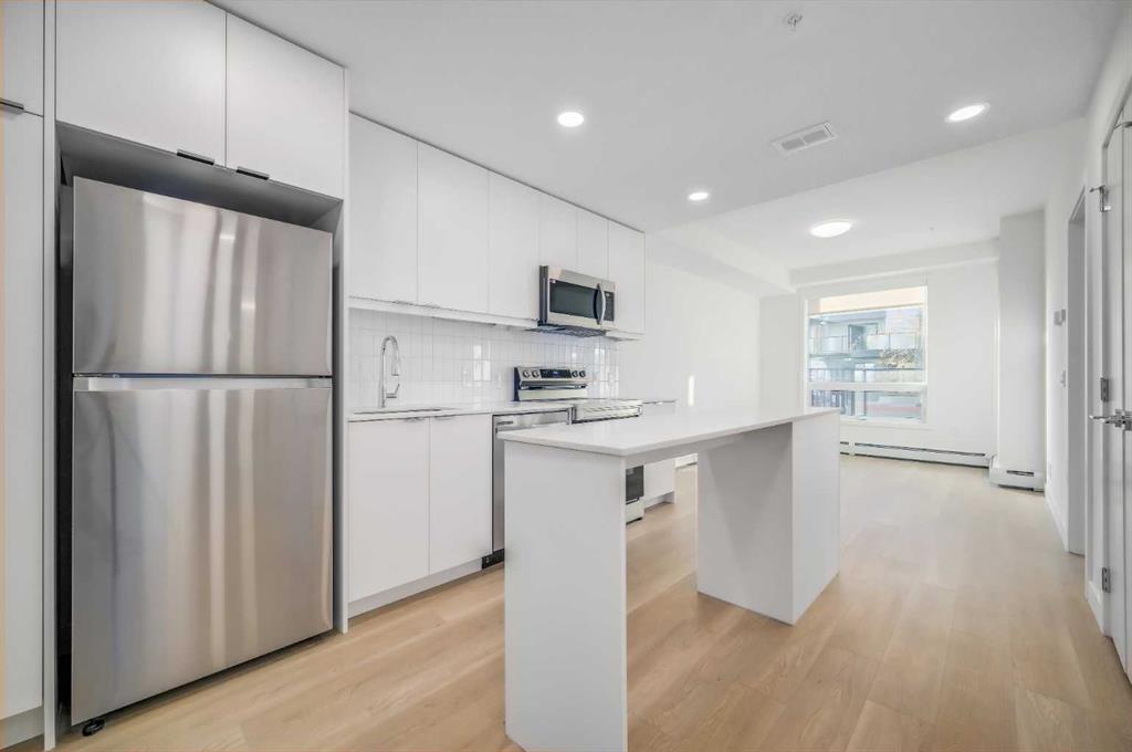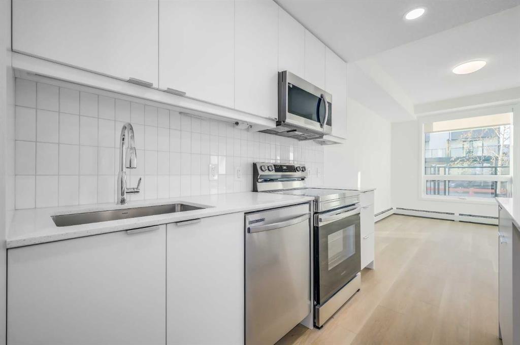Welcome to this bright and stylish main-floor condo nestled in the vibrant community of East Hills Crossing. Offering over 500 square feet of thoughtfully designed living space, this one-bedroom, one-bathroom residence perfectly blends comfort, functionality, with modern appeal and located on the quiet side of the building. (No traffic noise in this unit) The open-concept layout showcases sleek white cabinetry, elegant quartz countertops, and a spacious eating bar that seamlessly connects to the versatile dining area—ideal for both casual meals and entertaining guests. Expansive windows bathe the interior in natural light, creating an inviting atmosphere throughout. Step outside onto your private balcony to enjoy a peaceful morning coffee or unwind on sun-drenched afternoons. Everyday convenience is at your fingertips with in-suite laundry and a titled underground parking stall. Situated just steps from East Hills Shopping Centre, you’ll have effortless access to Costco, Walmart, Cineplex, restaurants, and essential services. Outdoor enthusiasts will appreciate nearby parks and walking trails, while quick access to Stoney Trail ensures easy connectivity across the city—plus, downtown Calgary is only a 20-minute drive away. Whether you’re a first-time buyer, downsizer, or savvy investor, this condo offers a complete lifestyle package in an unbeatable location. Don’t miss your opportunity to make this exceptional home yours—book your private showing today!