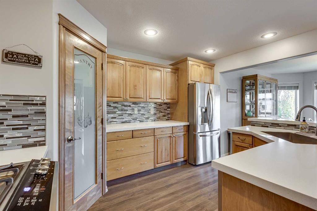 Welcome to this exceptional Canada West–built 2-storey home, perfectly situated on a quiet close in the highly sought-after Aspen Ridge neighbourhood. Surrounded by schools, shopping, and an abundance of parks and trail systems, this location offers the ideal balance of convenience and tranquility. Step inside to a grand foyer that immediately impresses with open sightlines to the main living area and a stunning custom staircase leading to the upper level. The chef-inspired kitchen is sure to impress with its quartz countertops, raised maple cabinetry, full tile backsplash, corner pantry, raised eating bar, and premium stainless-steel appliances—including a gas range. The spacious living room exudes warmth and style, featuring oversized windows, an elegant natural gas fireplace with a stone surround and mantle, and built-in wall speakers for the ultimate entertaining experience. The adjoining dining area offers seamless flow between the kitchen and living spaces, perfect for family gatherings or hosting guests. A main floor office (or potential bedroom), convenient 2-piece powder room, and well-appointed laundry room complete the main level. Upstairs, the thoughtful design continues with three generous bedrooms and two full bathrooms. The luxurious primary suite is a true retreat—complete with a large bedroom, private den or office space, spa-inspired 4-piece ensuite featuring an air-jetted tub, separate shower, makeup vanity, and an expansive walk-in closet. The fully finished basement is built for entertaining, showcasing a massive family large bedroom, a 4-piece bathroom, and a custom home theatre room—perfect for cozy family movie nights. Not to be overlooked, the oversized heated garage is a dream for any hobbyist, featuring epoxy flooring, a floor drain, and plenty of built-in storage. Step outside and enjoy your private east-facing backyard oasis with a covered deck (including a natural gas BBQ line), lower patio, mature trees, and a handy storage shed. Additional features include operational in-floor heating, central air conditioning, and central vacuum system. This meticulously maintained home offers the perfect blend of comfort, elegance, and functionality—an exceptional opportunity in one of Red Deer’s most desirable communities.