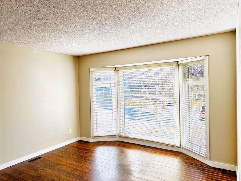 Move-in Ready Main Floor: Features a bright living room with a bay window, a dining area, and a kitchen with an eating bar. The flooring is a stylish mix of laminate hardwood and ceramic tile.