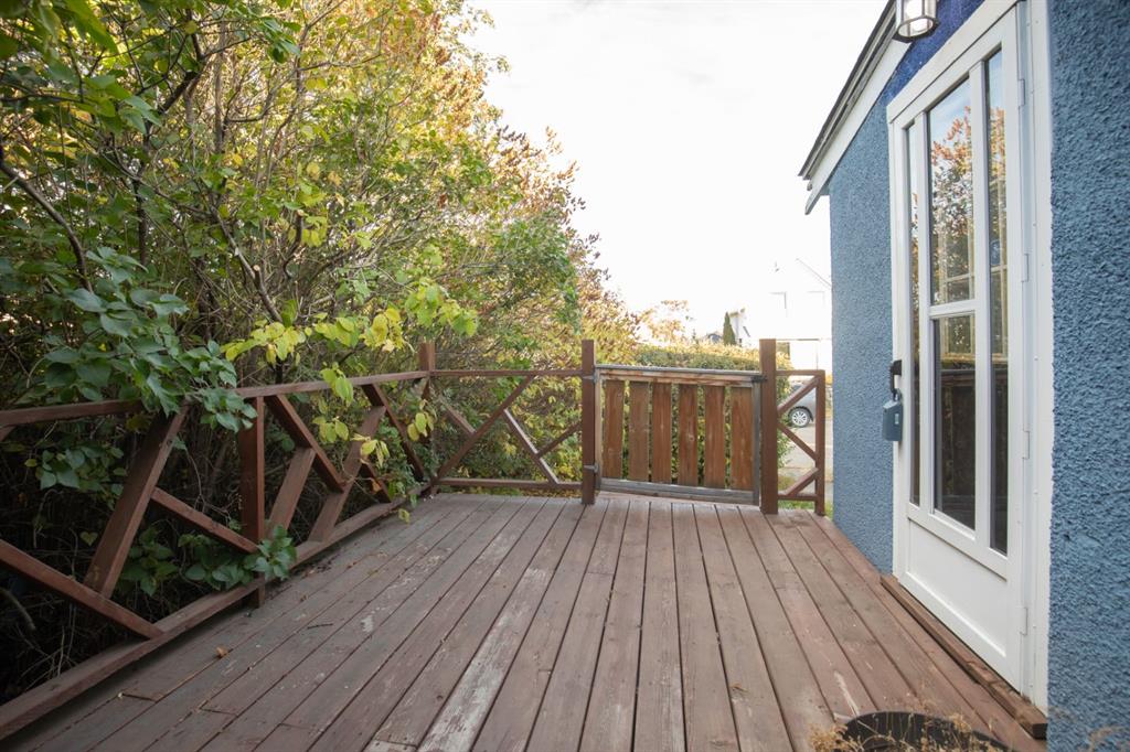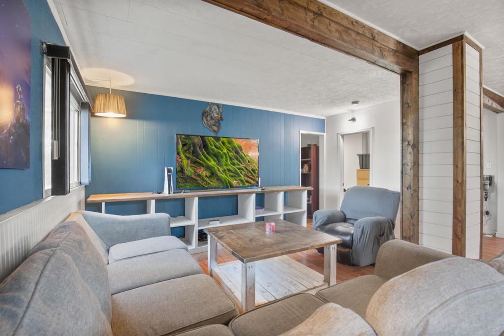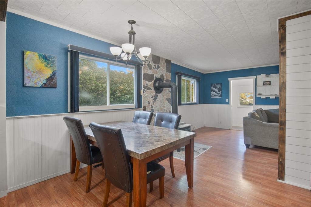 This charming 1946 bungalow blends timeless character with thoughtful modern updates, set on a spacious 6,000 sq ft lot in the heart of Bowden. Framed by mature hedges for privacy, the home welcomes you with a west-facing front deck and a generous entry foyer. Inside, the open-concept dining area flows into both the updated kitchen and cozy living room. Rustic wood beams and a wood-burning stove with a striking stone mosaic surround create a warm, inviting atmosphere.