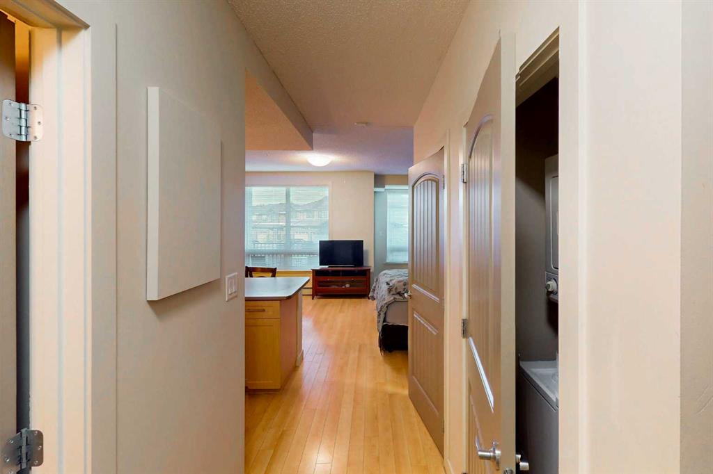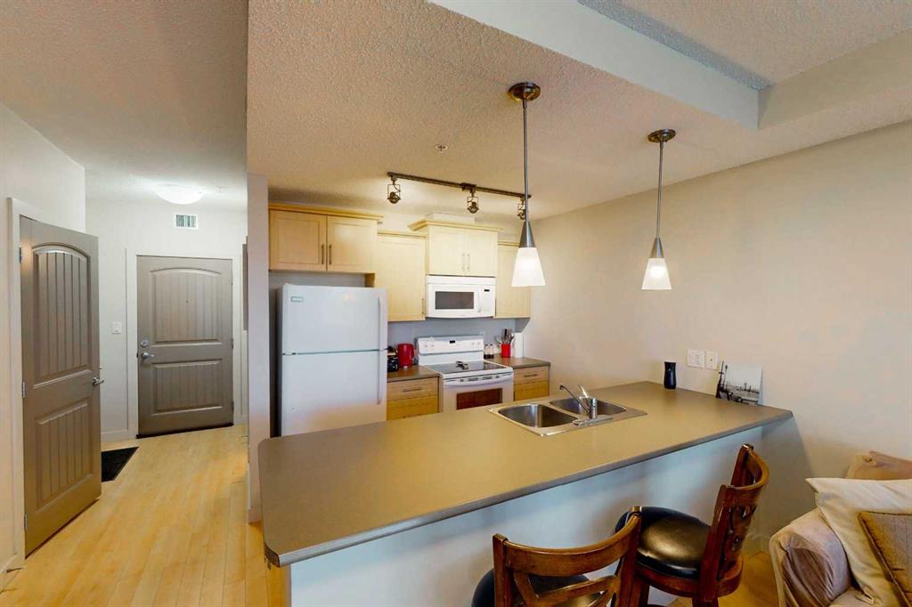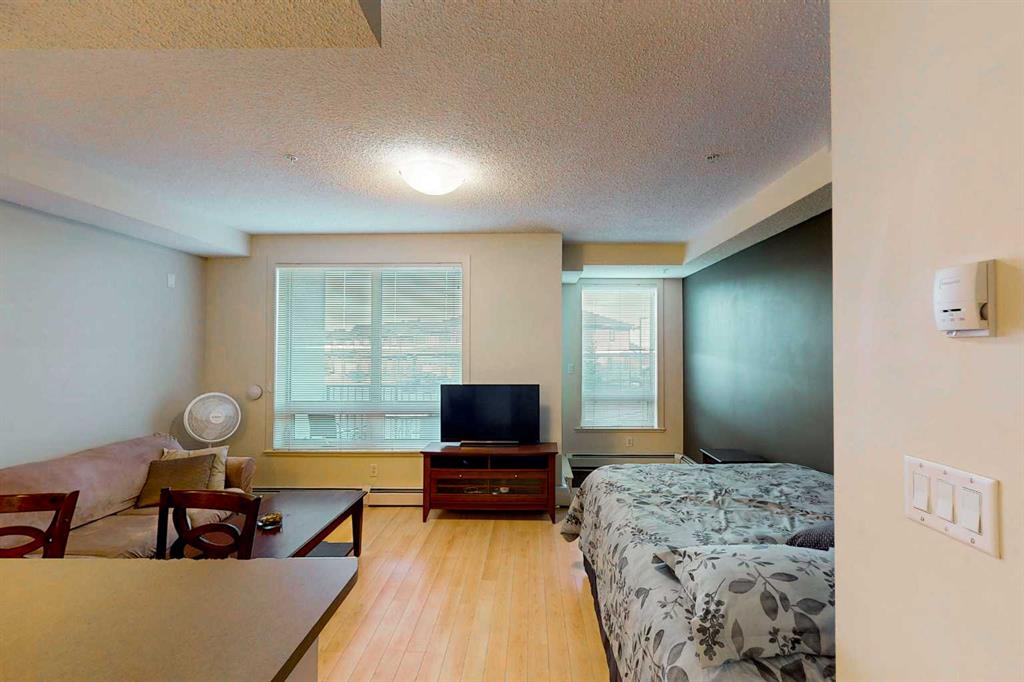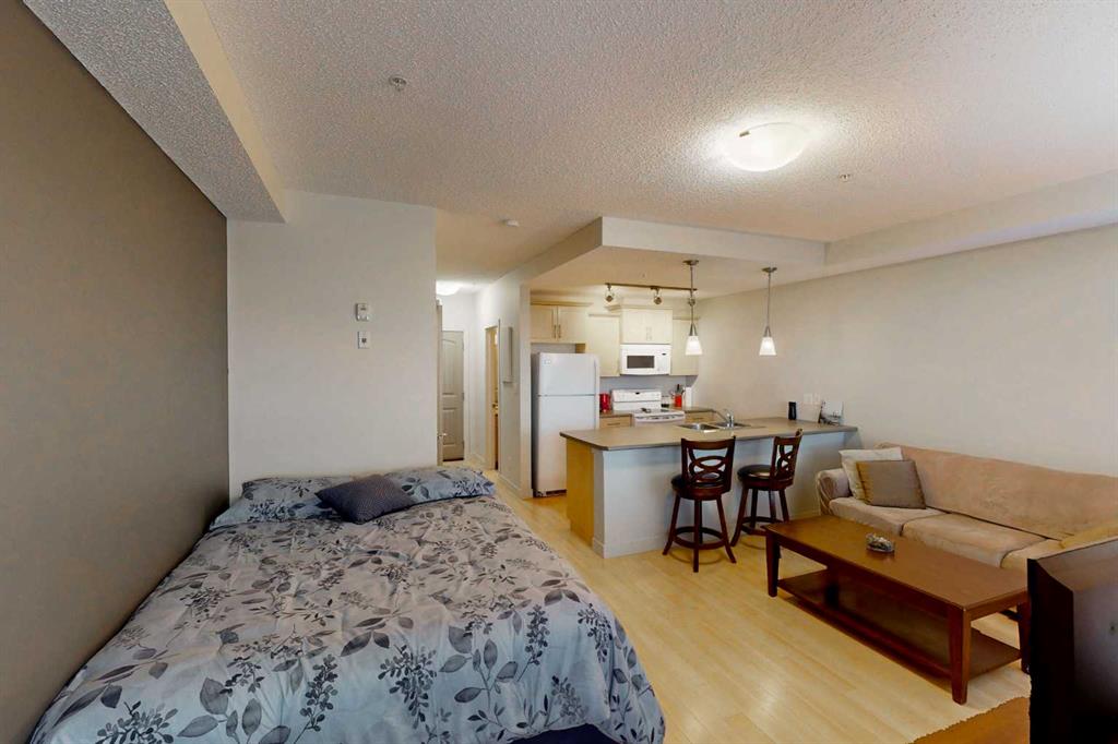 Welcome to The Vistas! ! Second floor, spacious and open bachelor suite in Eagle Ridge. Concrete building so very quiet for shift workers. Full size kitchen with huge island, 4 piece bath, in suite laundry and a spacious livingroom/bedroom making for the perfect hang out for the long distant commuter. Easy clean up with laminate flooring throughout. If you are a savvy investor then this is a unit that is super popular due to proximity of the bus stop, walking trails, restaurants, movie theatres, coffee shops and more. Spacious balcony from your living room where you can enjoy outdoor space that’s peaceful and private. Convenient gas hook up on the balcony if bbqing is something you love. This unit also comes with a titled above ground parking stall and a titled heated storage unit. On site gym for active residents when winter hits. Furniture is negotiable. Unit was freshly painted so all this unit needs now is YOU!