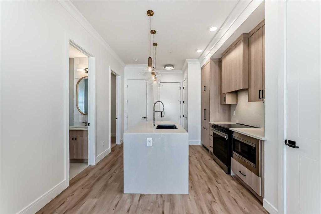 Step into modern luxury with this brand-new 1 bedroom + den 603 square feet home located on the ground floor of the award-winning University District. From the moment you walk in, you’ll notice the attention to detail—sleek quartz countertops, panel-ready appliances, soft-close cabinetry, and designer finishes that make every space feel elevated. The thoughtful floor plan includes a bright entrance, a contemporary kitchen with dining area, a spacious living room with oversized windows, and direct access to your private patio—perfect for morning coffee or winding down in the evening. The primary bedroom features a walk-in closet and a 4-piece bath completes the floor plan of this new and never-occupied home. A versatile den offers endless possibilities, whether as a home office, study space, or guest room. Added conveniences include in-suite laundry, underground parking, and a dedicated storage unit. Outside your door, you’ll enjoy a vibrant, walkable community with boutique shops, cafés, restaurants, parks, and green spaces. The building itself offers exclusive brand-new amenities designed to complement your lifestyle. With quick access to the University of Calgary, Market Mall, Foothills Medical Centre, and endless conveniences, this home offers the perfect blend of luxury and location. This is more than a home—it’s your gateway to elevated living in one of Calgary’s most sought-after communities.