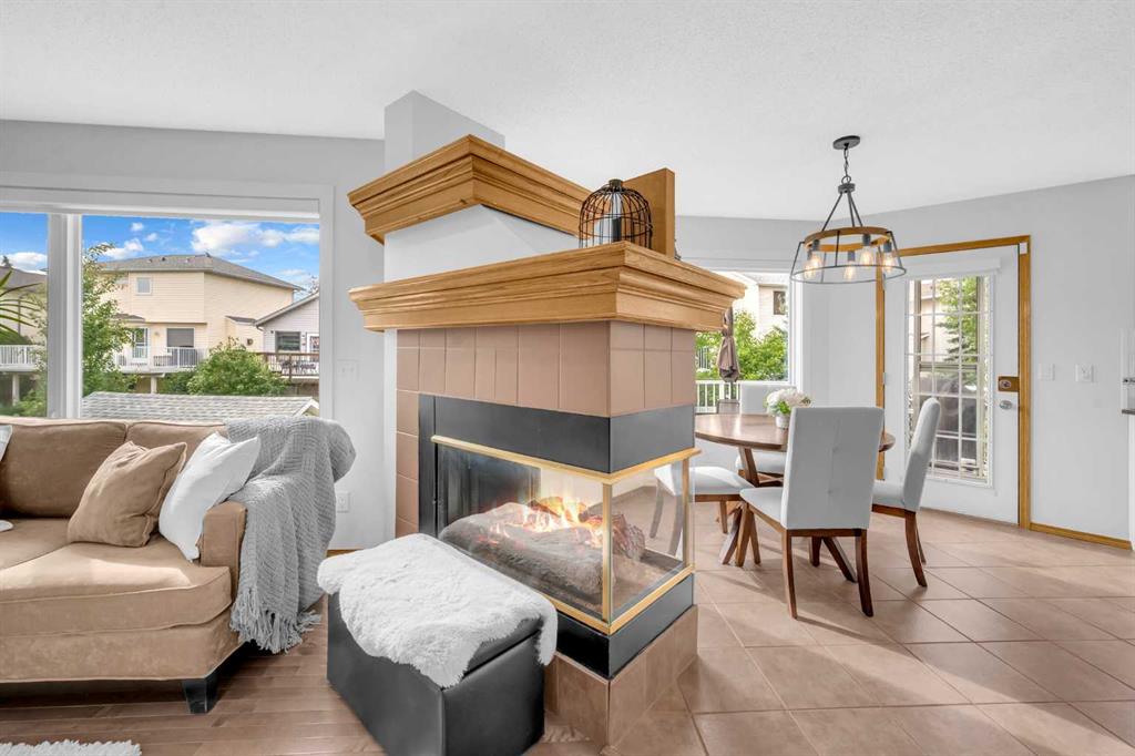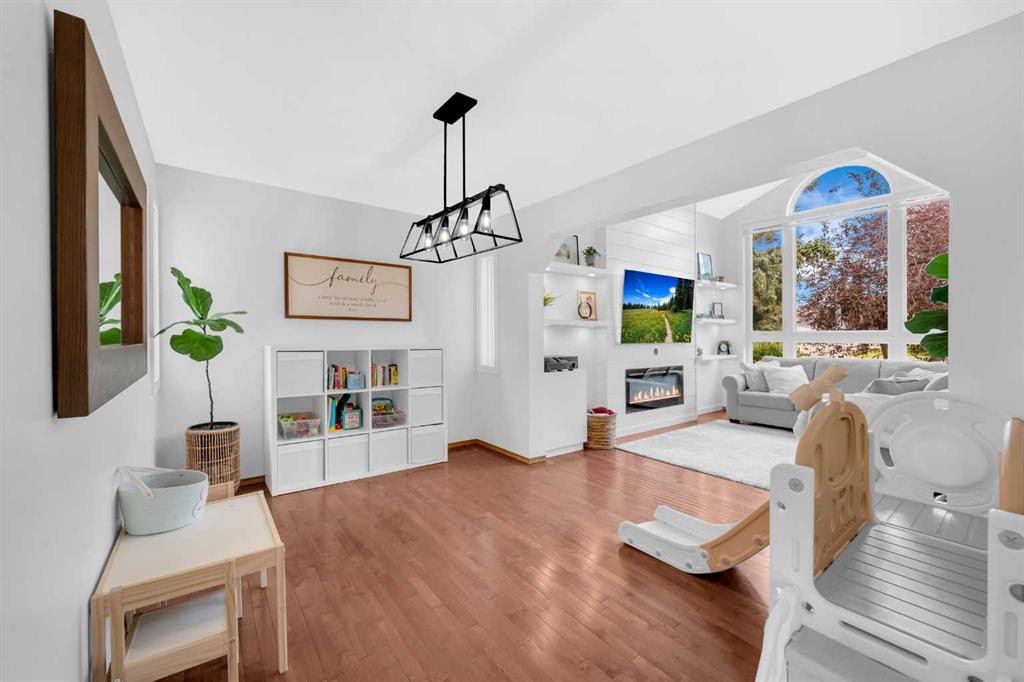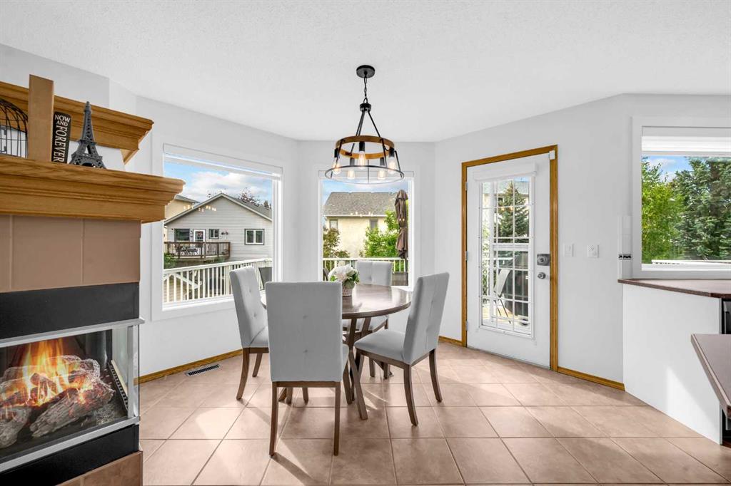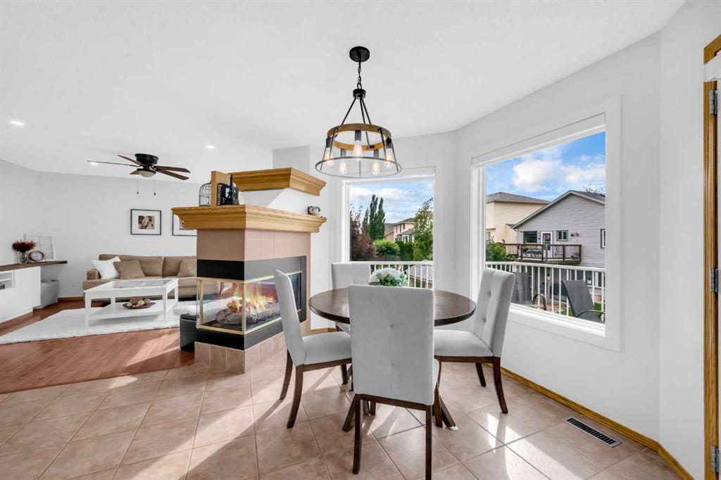 The timeless brick exterior and classic two storey with basement layout create instant curb appeal. Inside, you’re greeted by soaring cathedral ceilings, rich hardwood flooring, a stunning entry chandelier, and large windows that bathe the main floor in natural light. The open concept kitchen features stainless steel appliances, tile backsplash, corner pantry, and generous counter space, perfect for everything from family breakfasts to holiday baking. The adjacent breakfast nook opens onto a sunny west facing deck, ideal for outdoor dining or unwinding at the end of the day.