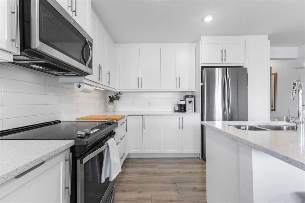 Step inside and you’ll immediately appreciate the open, airy layout, designer lighting, feature brick accent wall, and expansive windows that flood the home with natural light. The kitchen features upgraded stainless appliances (including a counter-depth fridge), modern cabinetry, and sleek double-roller blinds for privacy and light control.