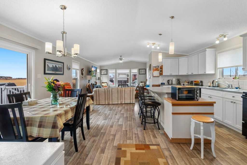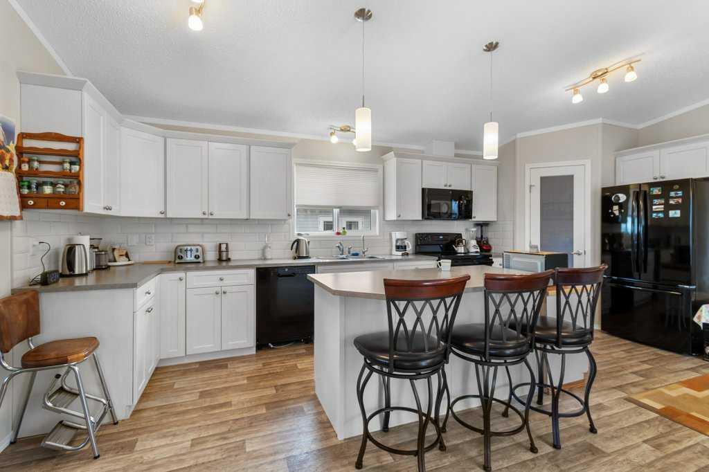 Located in the vibrant town of Sylvan Lake, this beautifully maintained home offers the perfect blend of comfort, convenience, and an active lifestyle. Enjoy all that Sylvan Lake has to offer—boating, golfing, nearby schools, shopping, and year-round recreation. Nestled in the desirable Lighthouse Point subdivision, this property sits on a spacious 50x130 ft corner lot at the end of a quiet cul-de-sac, backing onto a peaceful greenspace. The yard is fully landscaped and features a parking pad for two vehicles, an 8x12 storage shed, and a detached 29x19 heated garage—perfect for vehicles, hobbies, or extra storage. This bright and inviting 1,243 sq ft manufactured home is exceptionally well cared for, featuring vaulted ceilings and an abundance of windows that fill the space with natural light and durable linoleum flooring throughout for easy maintenance. The open-concept kitchen is designed for both function and style, complete with white cabinetry, a large island, breakfast bar, and a walk-in pantry. Appliances include a refrigerator, stove, dishwasher, microwave, reverse osmosis system, washer, and dryer. Sliding doors off the dining area lead to a sunny deck—perfect for morning coffee or evening relaxation. The spacious living room provides a comfortable gathering space, while the home’s two bedrooms include a generous primary suite with a four-piece ensuite and large walk-in closet. A second four-piece bath, convenient laundry area, and a side entrance opening to a 10x30 deck complete the layout. $101 Monthly fees include road maintenance, professional management, and contributions to the reserve fund, ensuring a well-maintained and worry-free community.
