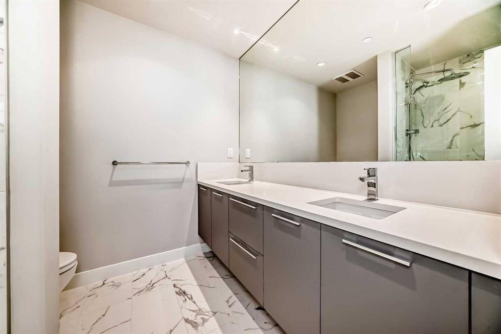 The primary bedroom boasts ample space and a generously sized closet. Mornings are a delight in the 4-piece ensuite, which features double sinks, vanity drawers, and a spacious step-in shower enclosed by a glass door. The second bedroom offers versatility, and serves as an ideal workspace or guest retreat. To top it all off, this unit includes an underground parking stall and a storage locker. EV parking options available.