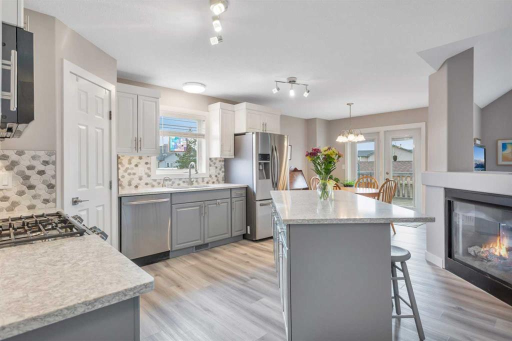 This beautifully renovated walkout bungalow blends open concept living with the warmth of natural light and west-facing views. Designed for connection and ease, the kitchen anchors the main floor with quartz countertops, statement backsplash, and updated appliances—all completed in a 2021 full-home remodel. The kitchen transitions into the dining area and living room, featuring vaulted ceilings and large windows. The cozy 3-way fireplace adds heart to the home.