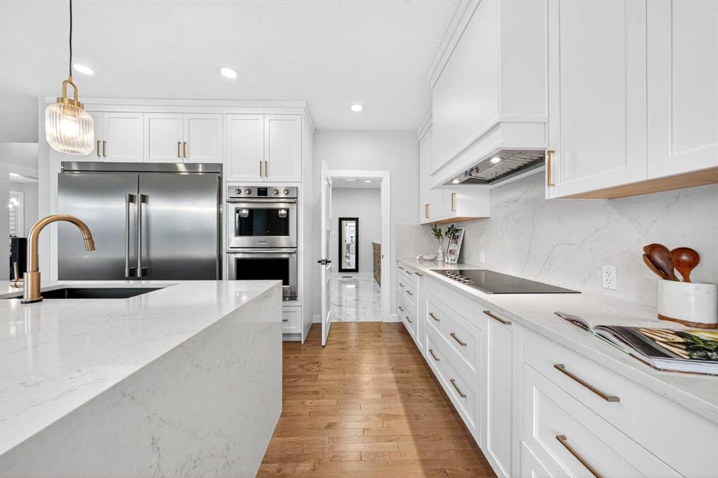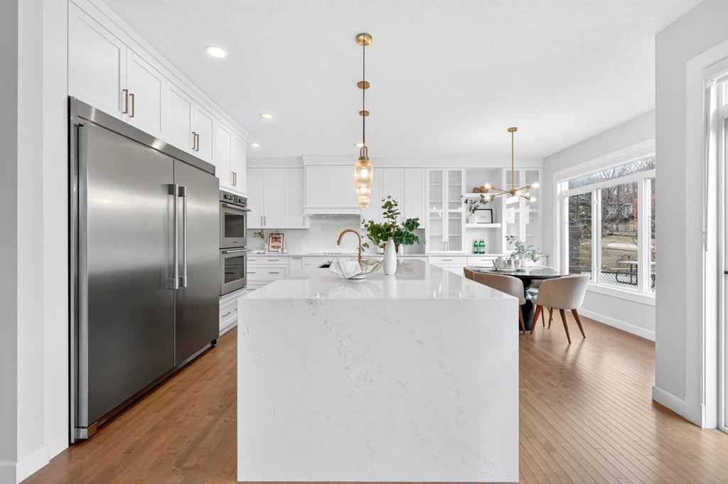 The gourmet Kitchen is a showpiece, featuring a massive quartz waterfall centre island (9’8” × 4’6”), stainless steel appliances including a Frigidaire Professional full-size side by side Fridge and Freezer, double wall oven, and electric cooktop, plus white soft-close cabinetry with gold hardware and quartz backsplash. A walk-through pantry and butler pantry with beverage fridge add storage and functionality, flowing seamlessly to the mudroom with built-in drawers, cabinets, and bench, which connects to the double attached garage with overhead storage. The Breakfast nook opens to a composite deck with aluminum and glass railing and gas hookup, perfect for outdoor dining and entertaining. A powder room completes the main level.