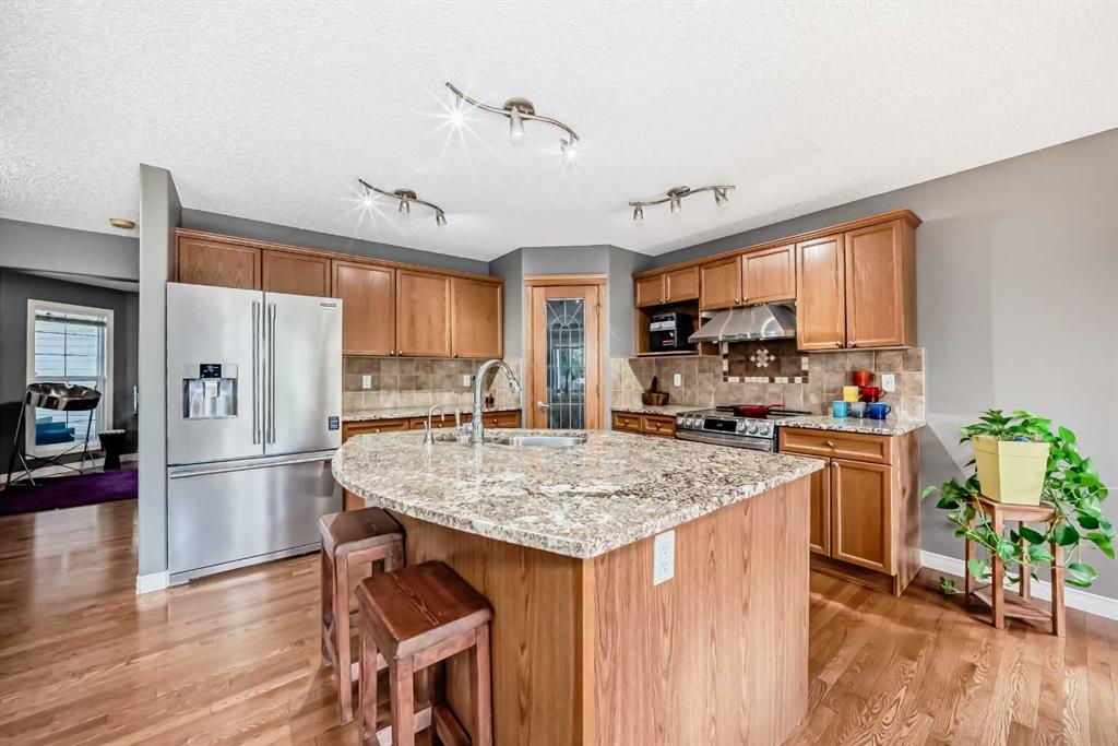 Welcome to this large family home sitting on a walkout lot with views of the Rocky Mountains! Just under 3000 total sq ft with a fully finished walkout basement. The main floor is wide open with upgraded kitchen cabinets and gleaming granite countertops. There is hardwood floors through to the kitchen, dining room & home office/den. The centre island is massive with dual undermount sinks and extra storage. There is plenty of cabinets and drawers plus a large corner pantry! Overlooking the front of the house is an oversized home office or den area~ perfect flex area for whatever you need. The garage is drywalled, insulated and heated. Upstairs you will love the custom wood railings and the huge Bonus room~ amazing entertainment space will hold any sized furniture. The Primary Bedroom has vaulted ceilings, a large walkin closet, a nice mountain view and an incredible 5 pce luxurious ensuite boasting dual sinks in the vanity, granite countertops, a deep corner soaker tub, a cozy stand up shower with corner seat and tiled floors. The two spare bedrooms are a good size (one has a handy walkin closet) and they can share the main 4 pce bathroom. The walkout level is fully finished with tiled flooring, knockdown ceiling with recessed lighting and large windows. There is a corner wet bar with upper & lower cabinets. The living room has a gas fireplace for extra comfort. There is one huge bedroom (the 4th one) and a large den (no closet but does have a stand up armoir & a big window). The basement has a full 4 pce bathroom as well. There is a good sized brick patio at the walkout entrance, a stone sidewalk comes from the front for easy access to the back. The private west facing backyard is a good size. The home has central AC, builtin vacuflo and can include the two spare fridges and the stand up freezer too. This is a great family for a large extended family. Easy walk to the Crestmont Community centre. Quick drive to get to the 16th Ave, Stoney Tr and downtown.