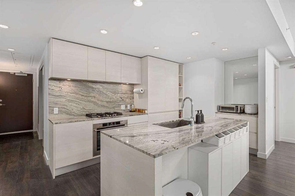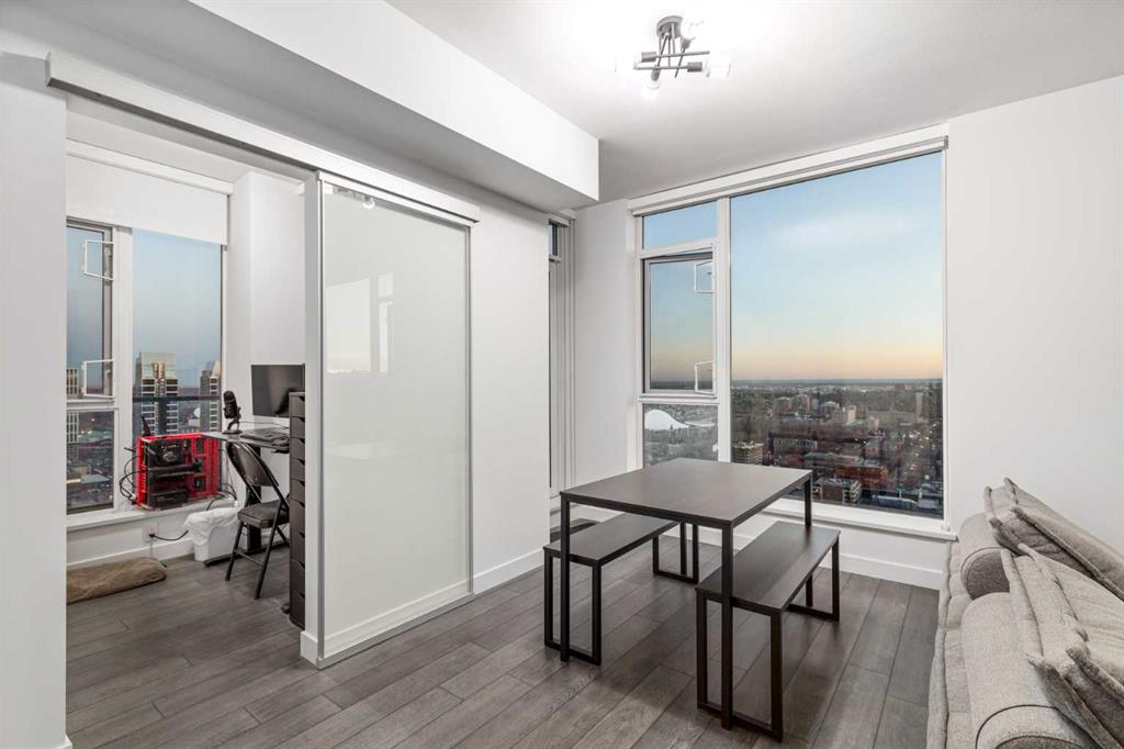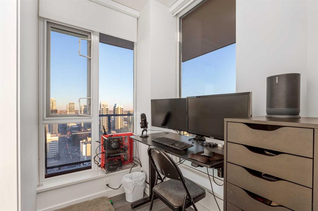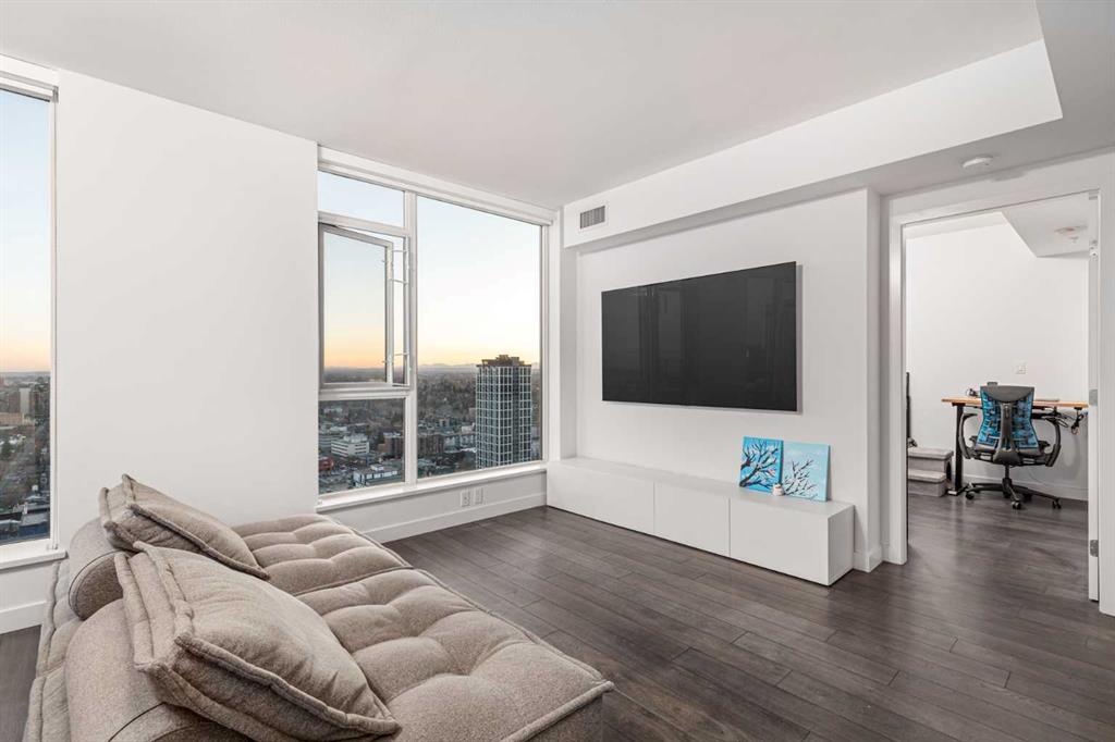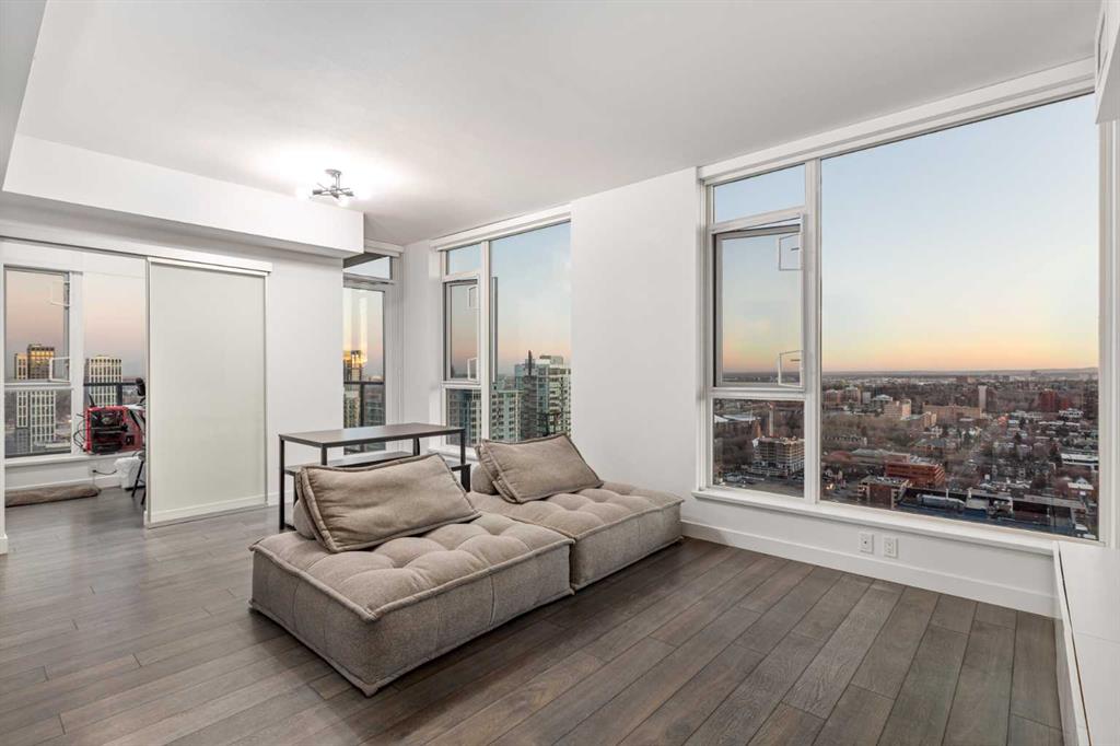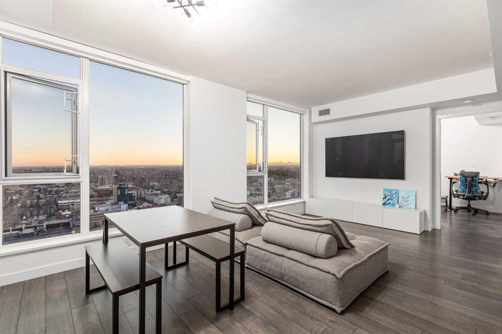 Perched on the 30th floor of the prestigious Park Point building, this stunning corner end unit offers an exceptional blend of luxury, sophistication, and urban convenience in the heart of Calgary’s vibrant Beltline. With soaring 9\' ceilings, this thoughtfully designed residence features 2 bedrooms, a versatile office/den, and 2 full bathrooms, creating a perfect balance of style and functionality. Floor-to-ceiling windows flood the space with natural light, showcasing breathtaking panoramic views of downtown Calgary, Central Memorial Park, and the majestic Rocky Mountains. The open-concept design enhances the spacious feel, making it ideal for both relaxing and entertaining. At the heart of the home, the Italian-designed Armony Cucine kitchen is a masterpiece of form and function, featuring full-height cabinetry with soft-close drawers, under-cabinet lighting, premium stainless steel appliances including a gas cooktop, real granite countertops and backsplash, and high-end Hansgrohe fixtures. The expansive island with a breakfast bar provides additional prep space, while a dedicated coffee/beverage station adds a touch of everyday luxury. The living and dining areas offer an inviting ambiance with south-facing views, creating the perfect setting for unwinding or hosting guests. The den/office is surrounded by large windows, provides an inspiring workspace with incredible unobstructed views of the downtown skyline and the Rocky Mountains—a rare feature that elevates both productivity and relaxation. The primary suite is a private retreat, featuring a walk-through closet leading to a spa-inspired 5-piece ensuite with a soaker tub, dual sinks, and an oversized glass-enclosed shower. The second bedroom offers additional comfort with expansive city views and ample storage space, while the 4-piece guest bath includes an oversized shower. Completing the home is a full-size in-suite laundry and air conditioning, ensuring comfort and convenience year-round. This unit comes with underground parking and storage locker for added convenience. The pet-friendly Park Point building offers world-class amenities, including a fully equipped fitness center, Yoga studio, sauna and steam room, resident’s lounge, party room, outdoor courtyard with a BBQ station, and a car/pet wash bay. Ideally located in the heart of the Beltline, Park Point provides unmatched walkability with Central Memorial Park and the Memorial Park Library right across the street, Haultain Park and its tennis courts just steps away, and an array of top-rated restaurants and cafés nearby. The shopping, entertainment, and nightlife of 17th Avenue are minutes away, while the Saddledome and Stampede Park offer year-round events and sports. For those who work downtown, the +15 entrance is just one block away, ensuring seamless connectivity. This meticulously crafted residence delivers the ultimate urban lifestyle with unparalleled views, premium finishes, and top-tier amenities. Don’t miss this opportunity!
