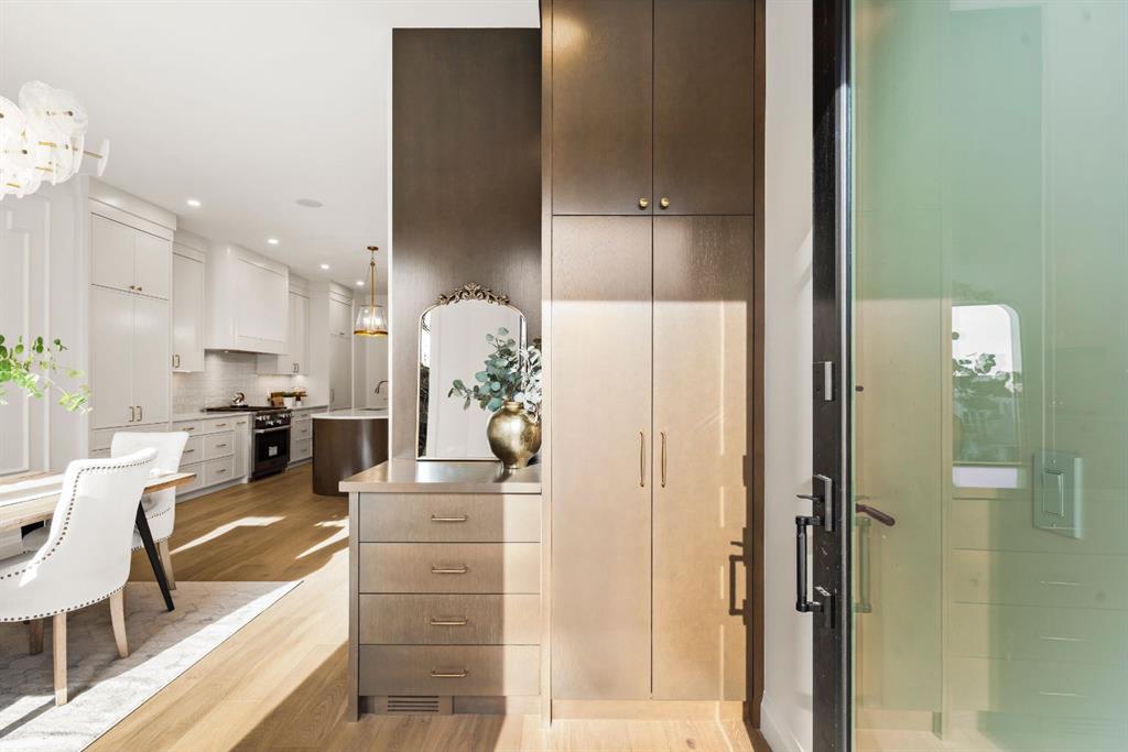 Step inside to soaring 10-foot ceilings, wide-plank white oak floors, and natural light that fills every corner. The open-concept main floor flows seamlessly from the chef’s kitchen — complete with custom millwork and a full Miele appliance package — to the inviting living area anchored by a sleek gas fireplace and full dining space perfect for family gatherings and entertaining.