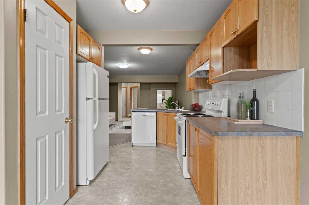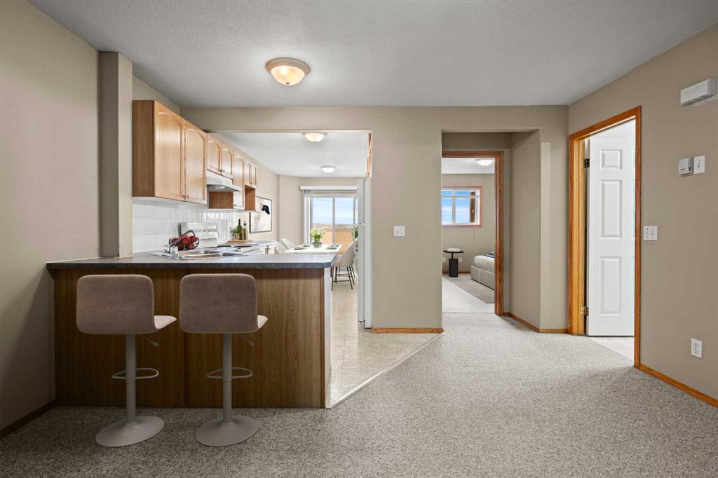 2 BEDROOMS | 1 BATHROOM | 872 SQFT | OPEN LAYOUT | DECK | BACKING ONTO GREEN SPACE | PARKING STALL | Welcome to this starter home, perfect for a first time home buyer or to purchase as an investment property. Upon entering , you are greeted with an abundance of natural light and an open floor plan. The spacious living room opens into an inviting kitchen, then connecting to a dining room that opens onto a generous deck overlooking a green space with no neighbours behind you. This home comes complete with 2 bedrooms, a 4-piece bathroom, in-suite laundry and a parking stall directly outside your front door. This complex is very well managed and is close to downtown, shopping, a golf course and has easy access to major road ways. This great opportunity won\'t last long. Book your showing today and don\'t miss out! Photos have been virtually staged.