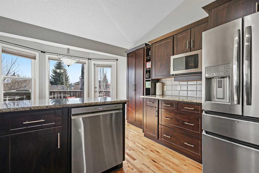 Welcome home! This inviting bi-level walkout home combines warmth, style, and thoughtful upgrades and nicely nestled on a huge treed lot with direct access to peaceful green space right out your back door! The open-concept main level features soaring ceilings that fill the living and dining areas with natural light and the beauty of real hardwood floors add warmth and timeless charm throughout. The updated kitchen showcases maple cabinetry, granite countertops, and brand-new stainless steel appliances, offering both beauty and functionality. Two spacious bedrooms on the main level (easily converted back to three) plus two full bathrooms provide flexibility and comfort for family or guests. The bright walkout lower level features in-floor heating, wide-plank luxury vinyl flooring, a large recreation room with cozy gas fireplace, a third & 4th bedroom (or den),, laundry and a stylish 3-piece bathroom — ideal for additional living space, guests, or a home office. Step outside to enjoy a rubberized exterior deck, permanent exterior decorative lighting, large shed and a sunny south-facing yard with landscaped grounds accented by stonework and Rundle Rock detailing. Major features include newer shingles + leaf filter system, updated windows, furnace, HWT and water softener …. all providing peace of mind and lasting value. An oversized garage completes this exceptional property. Backing onto miles of walking paths and open space, this home offers the perfect blend of comfort, and a location that is close to everything that matters.
